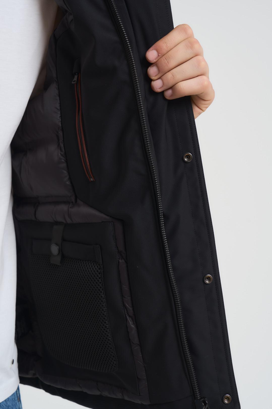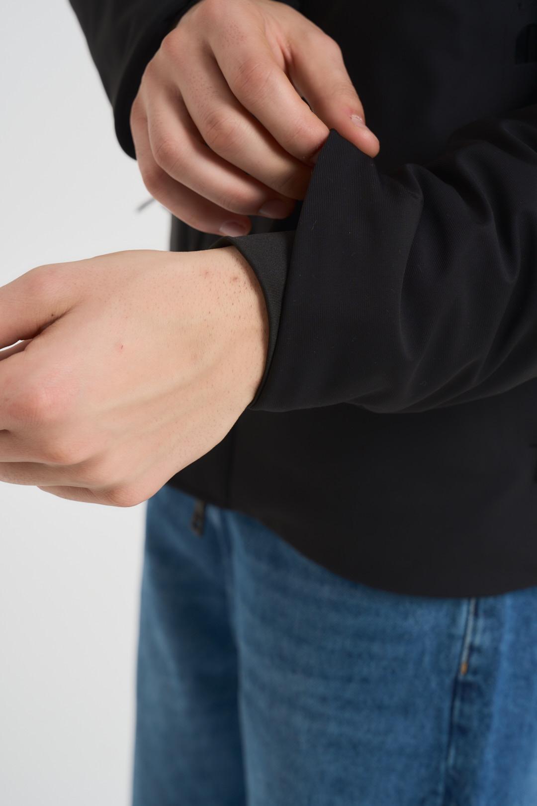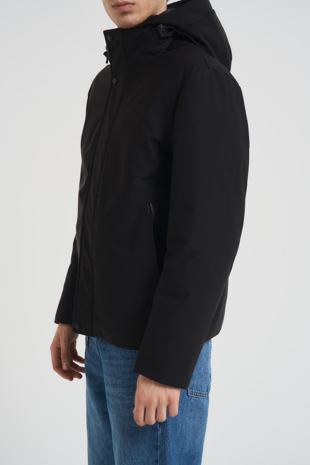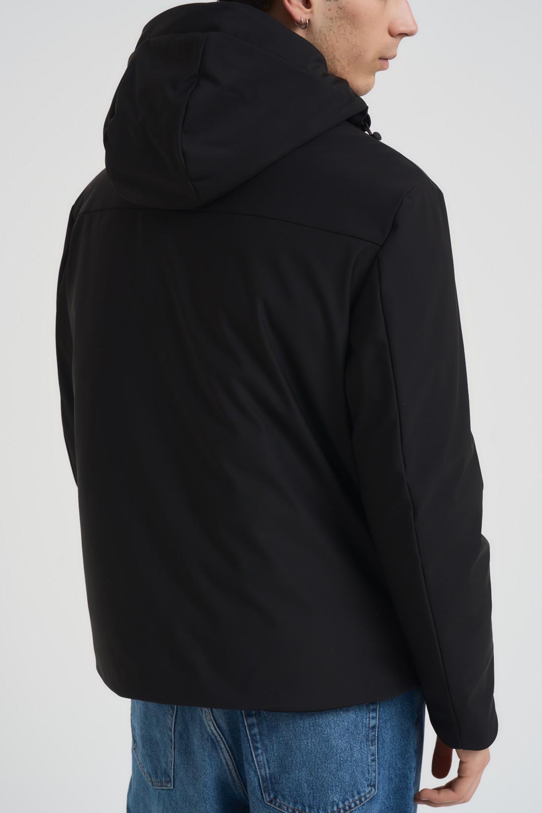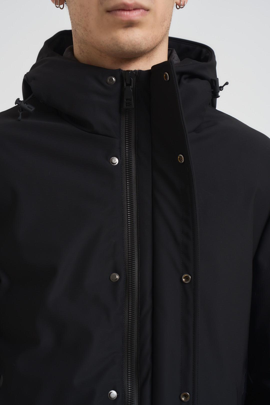 SSEINSE Giubbotto uomo con cappuccio nero. Modello corto, con chiusura a zip e due tasche a filetto. Composizione: 100% nylon. Il modello è alto 190cm e indossa la taglia L.