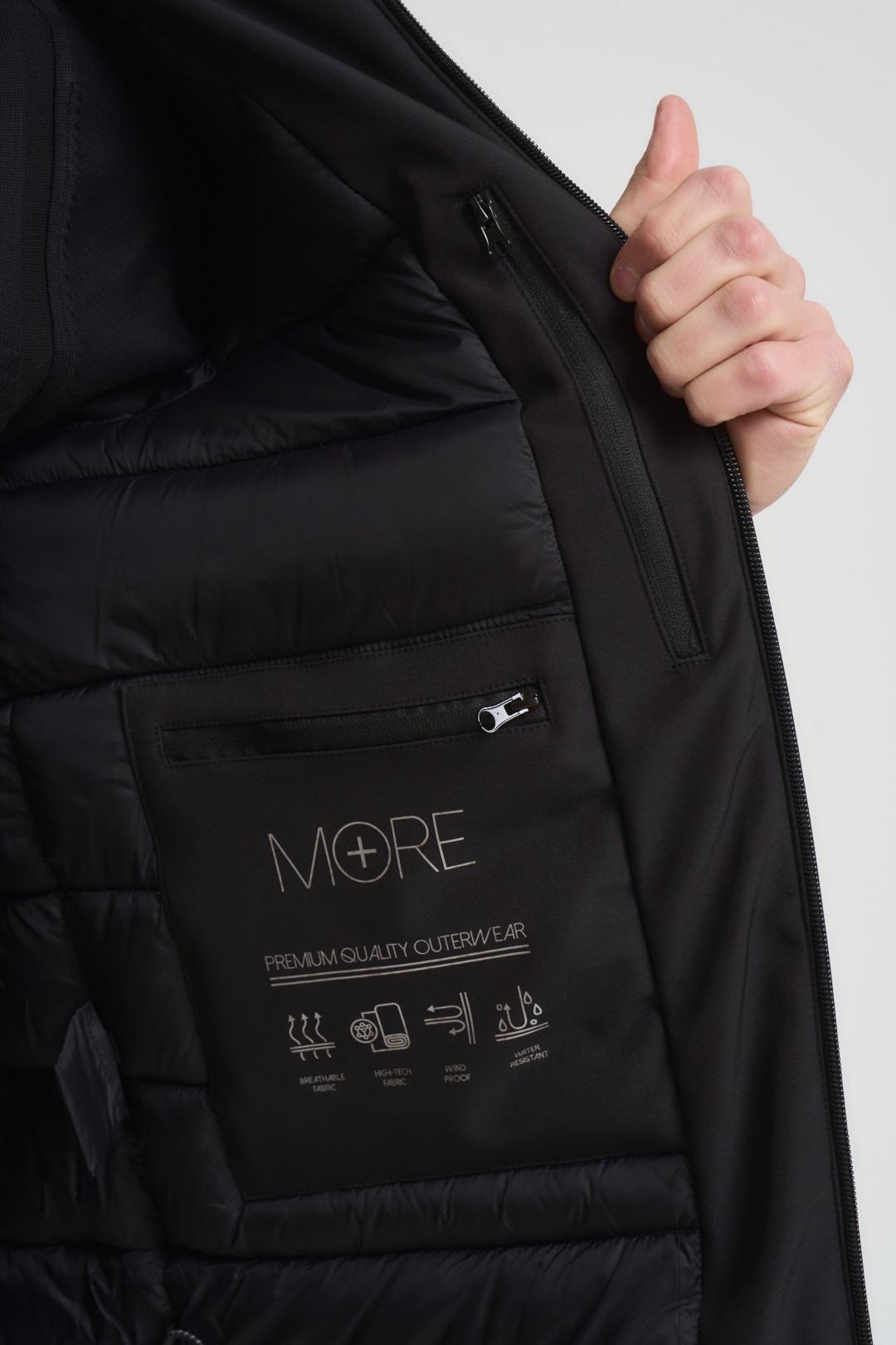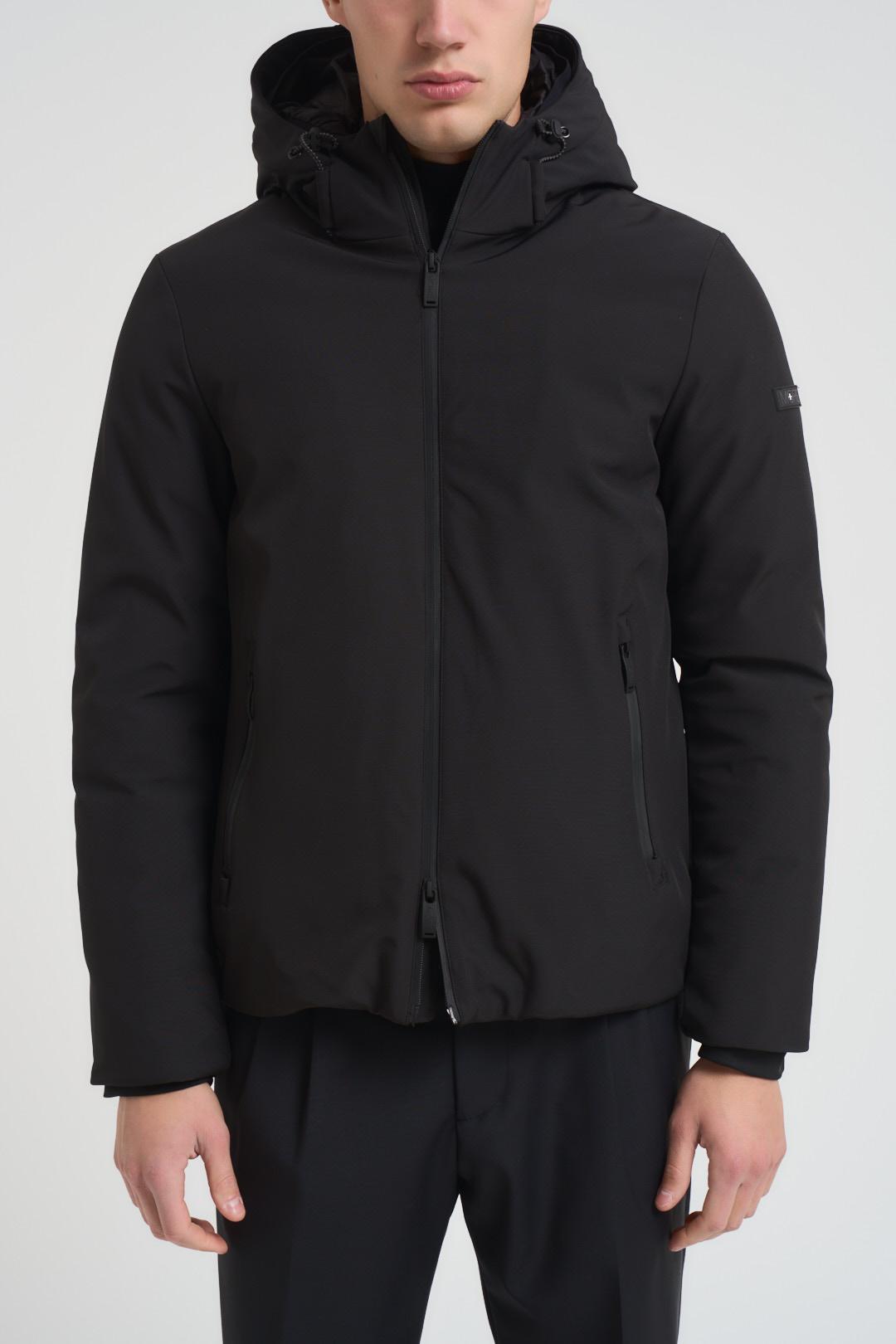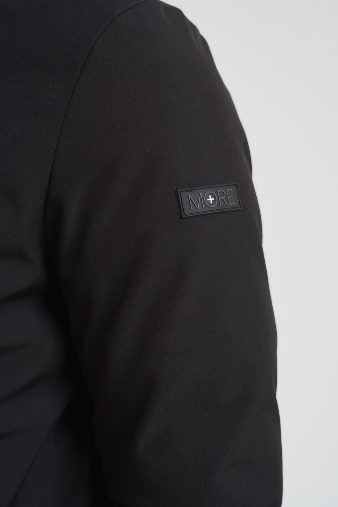 MORE Giubbotto uomo con cappuccio nero. Modello corto. Cappuccio con elastico regolabile. Manica lunga. Chiusura frontale con zip a doppio cursore. Tasche laterali con chiusura con zip. Polsino elasticizzato. Logo su manica. Tasche interne con chisura con zip. Composizione: 95% poliestere, 5% elastane. Il modello è alto 190 cm e indossa la taglia L.