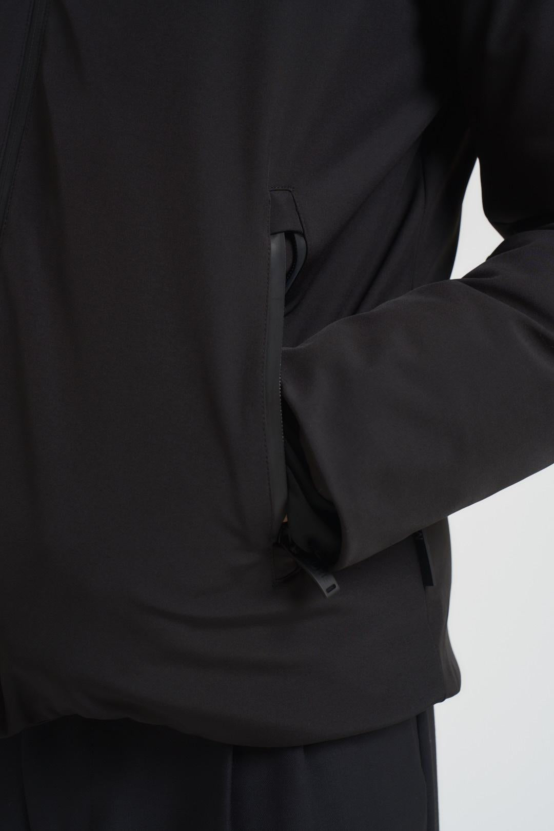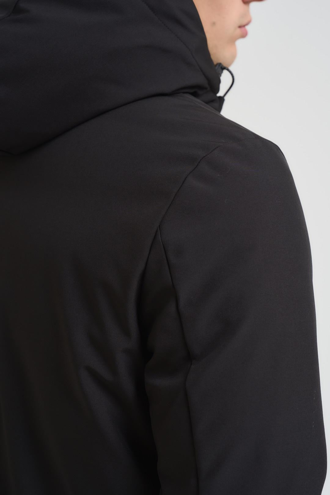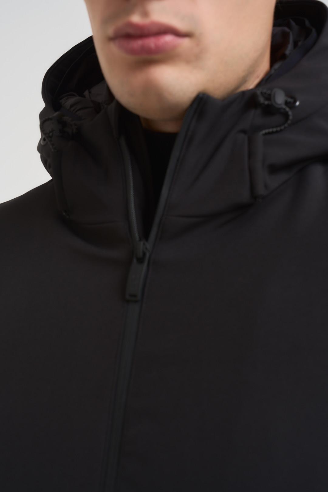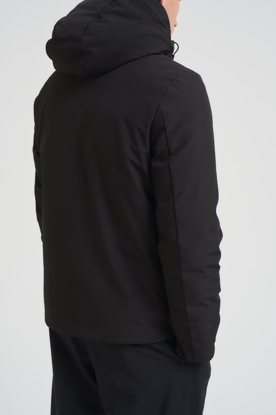 MORE Giubbotto uomo con cappuccio nero. Modello corto. Cappuccio con elastico regolabile. Manica lunga. Chiusura frontale con zip a doppio cursore. Tasche laterali con chiusura con zip. Polsino elasticizzato. Logo su manica. Tasche interne con chisura con zip. Composizione: 95% poliestere, 5% elastane. Il modello è alto 190 cm e indossa la taglia L.
