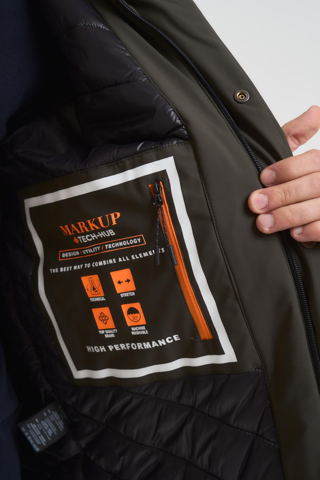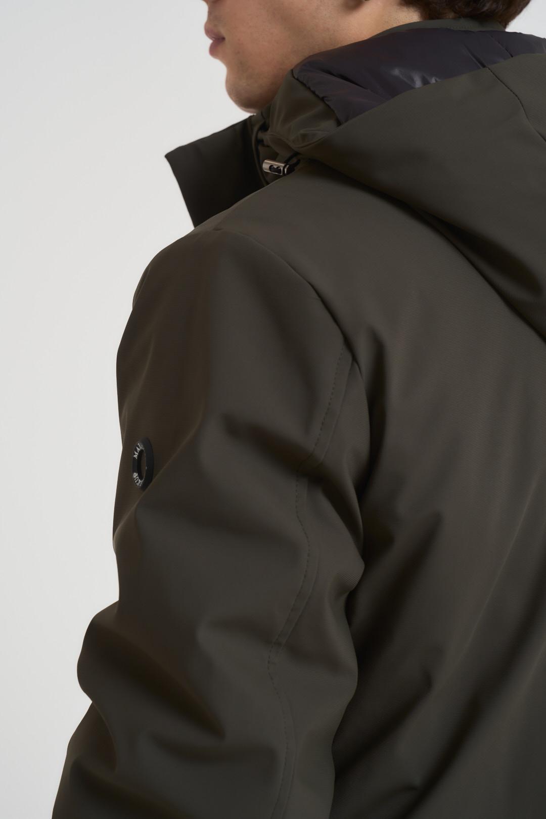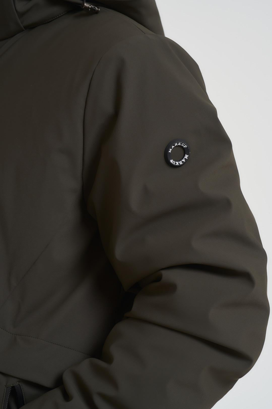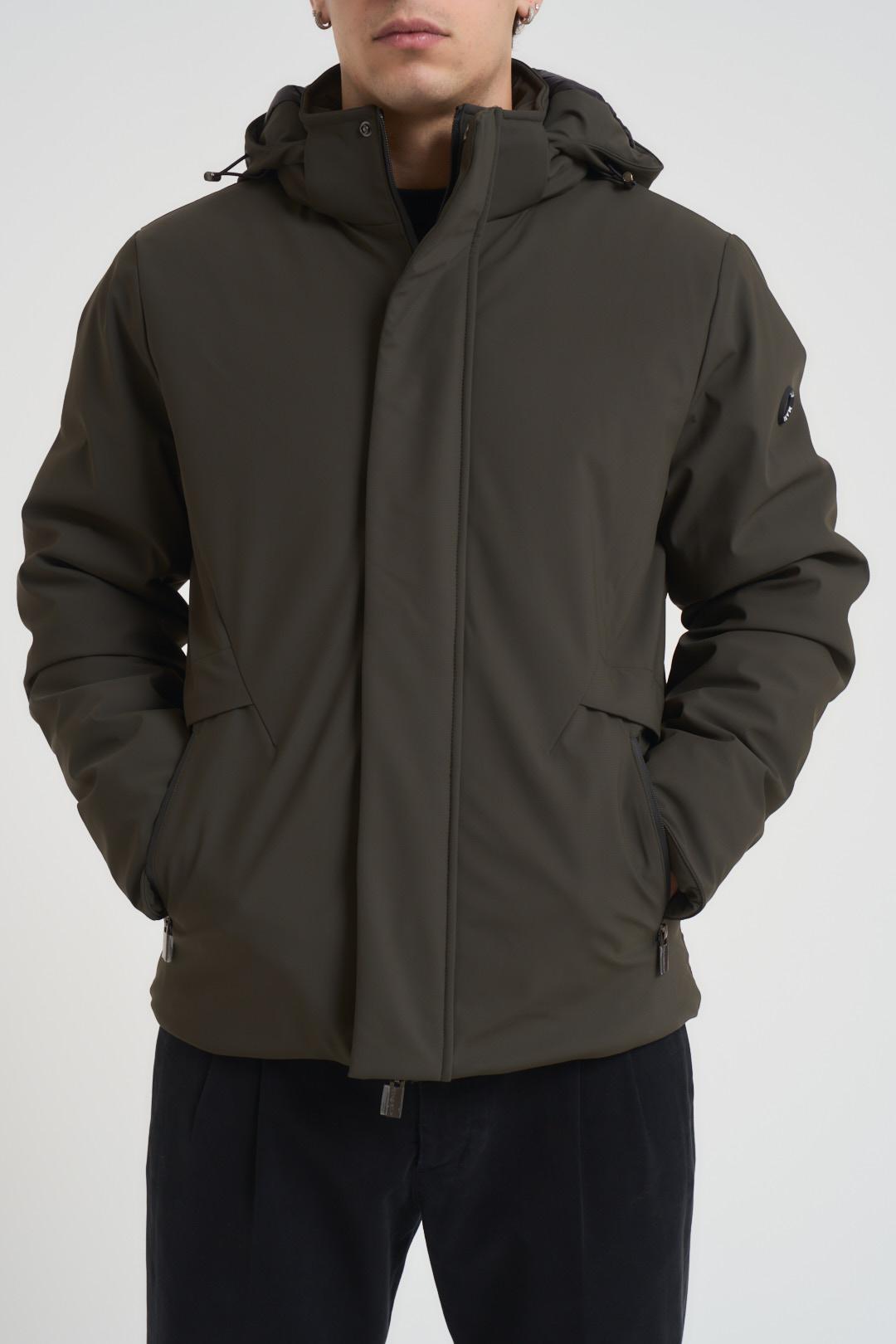 MARKUP Giubbotto uomo con cappuccio verde militare. Modello corto e imbottito. Cappuccio con laccetti regolabili. Chiusura frontale con zip e bottoni a pressione. Tasche laterali con zip. Tasca interna con zip. Manica lunga. Composizione: 75% nylon, 25% elastane. Il modello è alto 190 cm e indossa la taglia L.