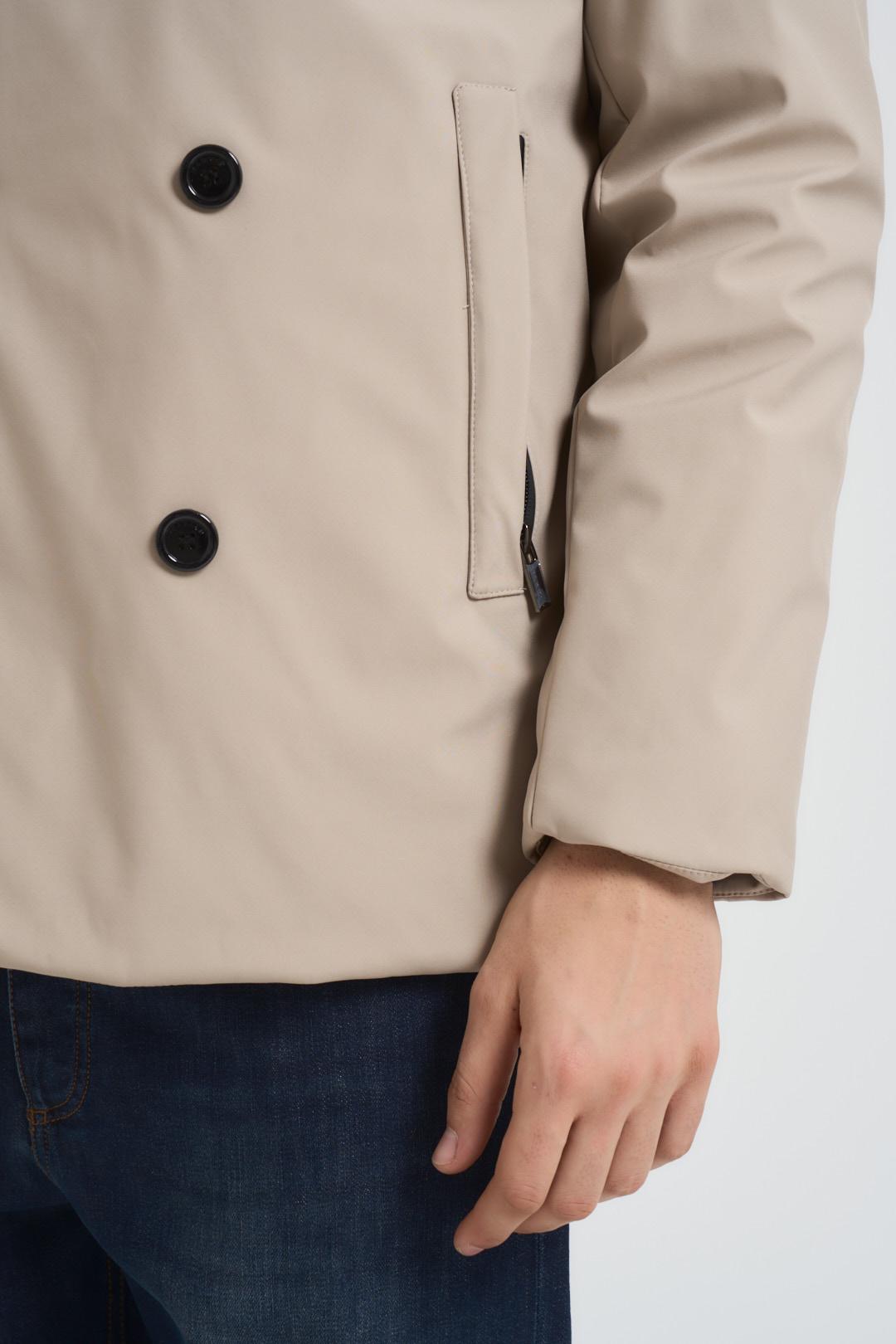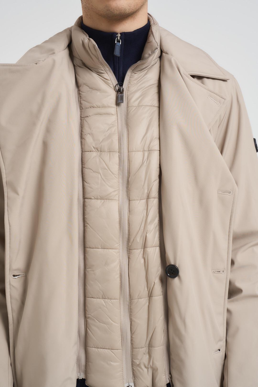 MARKUP Giubbotto uomo doppiopetto beige. Modello con pettorina interna inbottita e removibile con zip. Chiusura frontale con bottoni e zip. Tasche laterali con chiusura con zip. Composizione: 100% poliestere. Il modello è alto 190cm e indossa la taglia L.