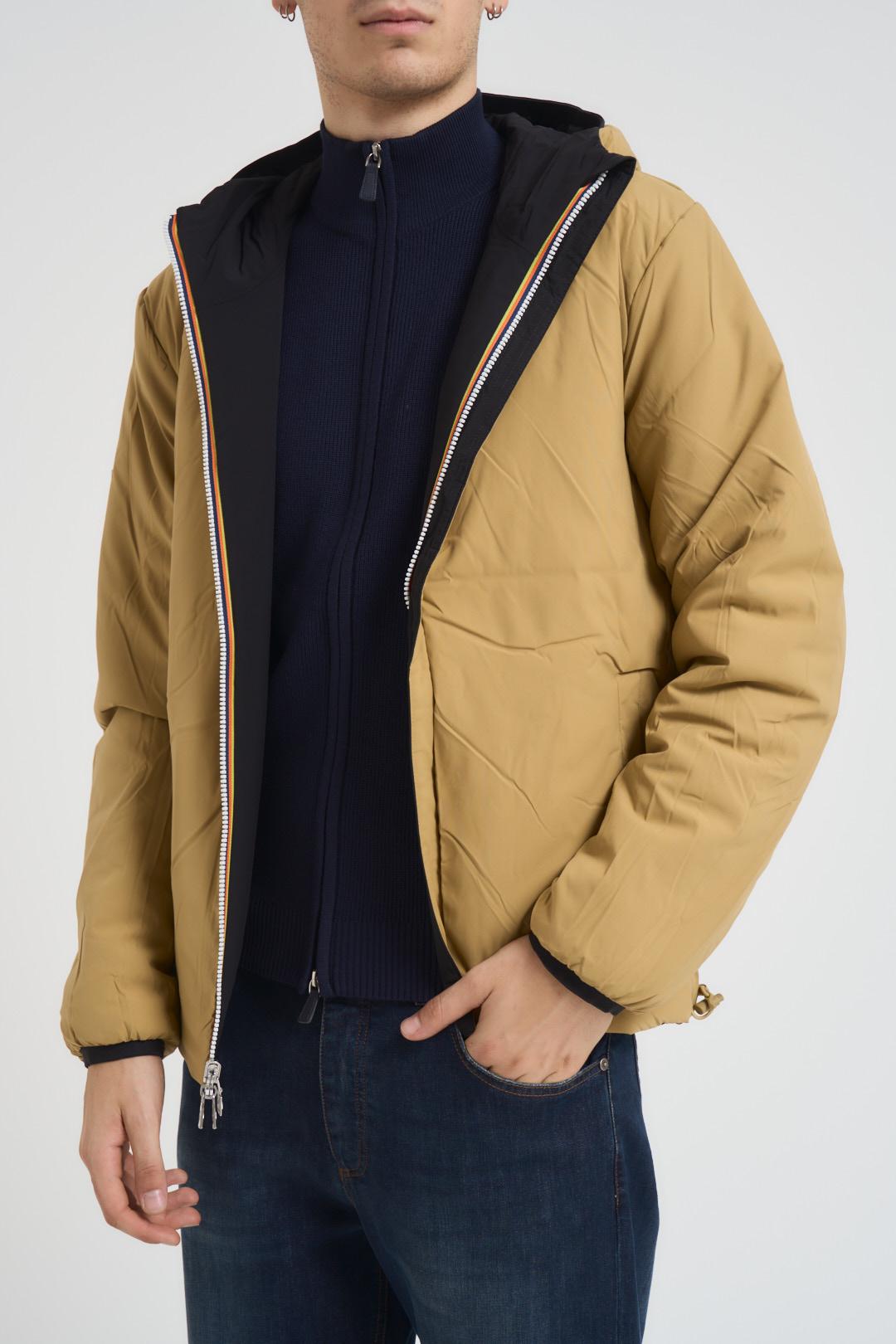 K-WAY Giubbotto uomo double face nero e beige. Modello impermeabile, idrorepellente, antivento, traspirante, con cappuccio regolabile da coulisse. Reversibile con interno verde. Cuciture termonastrate. Chiusura con zip e polsini con elastico. Due tasche con zip. Imbottitura: 100% Poliestere. Esterno: 8% Elastan 92% Nylon. Il modello è alto 190cm e indossa la taglia L.