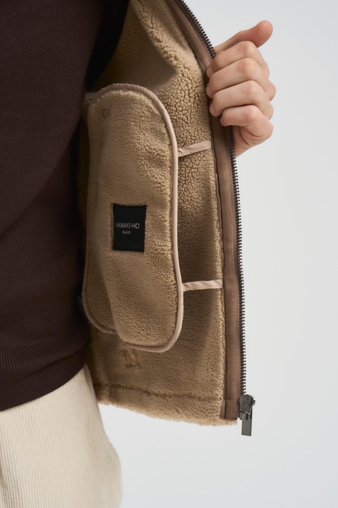 HAMAKI-HO MILANO Giubbotto uomo eco montone marrone. Modello con chiusura frontale con zip. Tasche oblique con chiusura con zip. Colletto classico. Polsi, colletto, fondo e interno giacca in ecopelliccia effetto teddy. Fibbie ai lati. Composizione. 100% Poliestere. Il modello è alto 190 cm e indossa la taglia L.