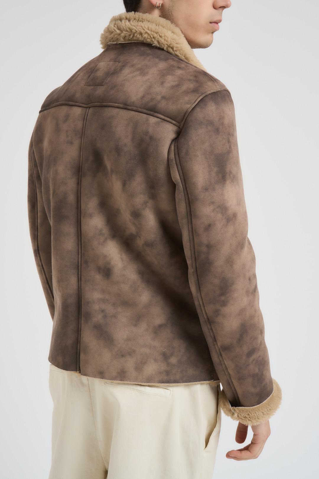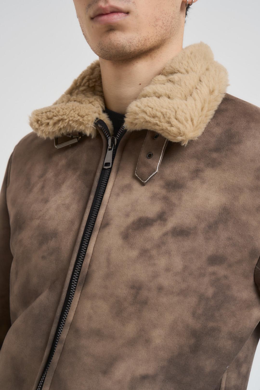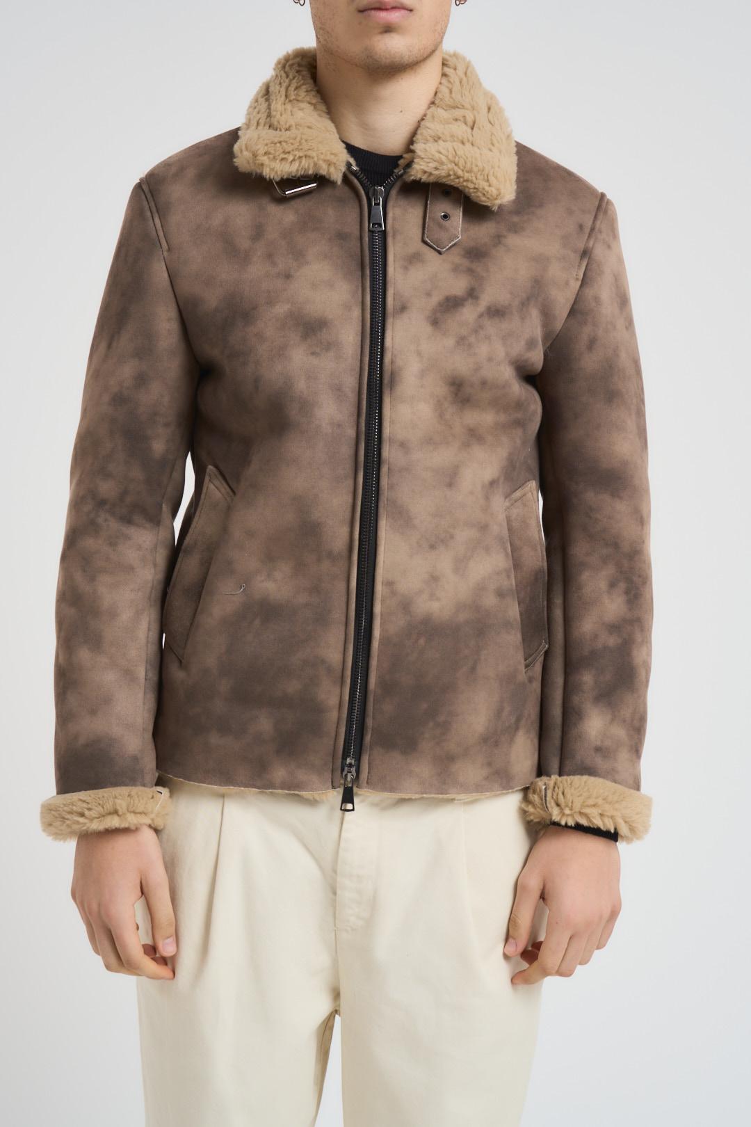 BERNA Giubbotto uomo ecomontone marrone. Modello con colletto, orlo ed interno in pelliccia sintetica beige. tessuto con effetto sfumato. Chiusura centrale con zip metallica e cinturino regolabile altezza collo. Tasche taglio americano sul fronte e fondo dritto. Composizion: 100% poliestere. Il modello è alto 190cm e indossa la taglia L.