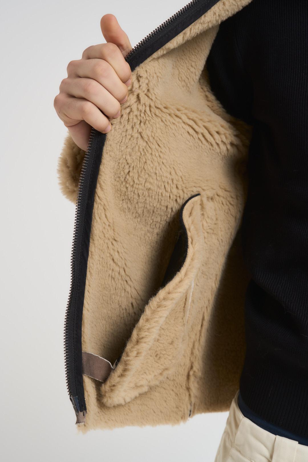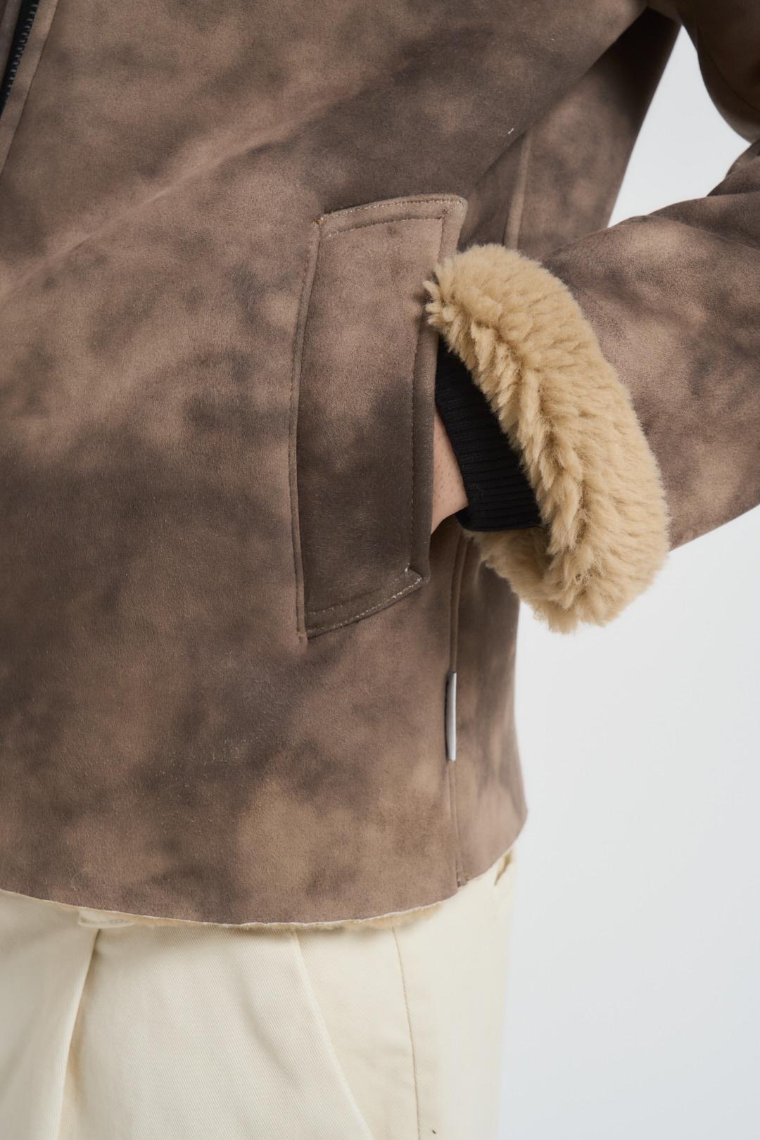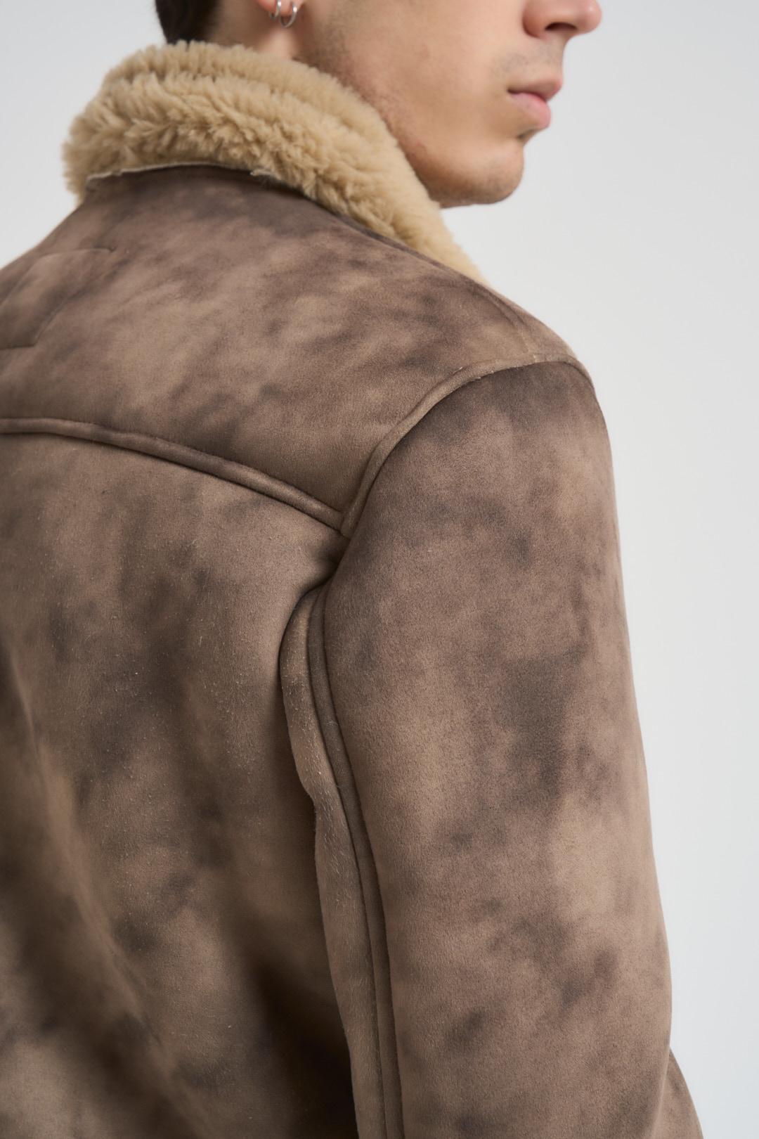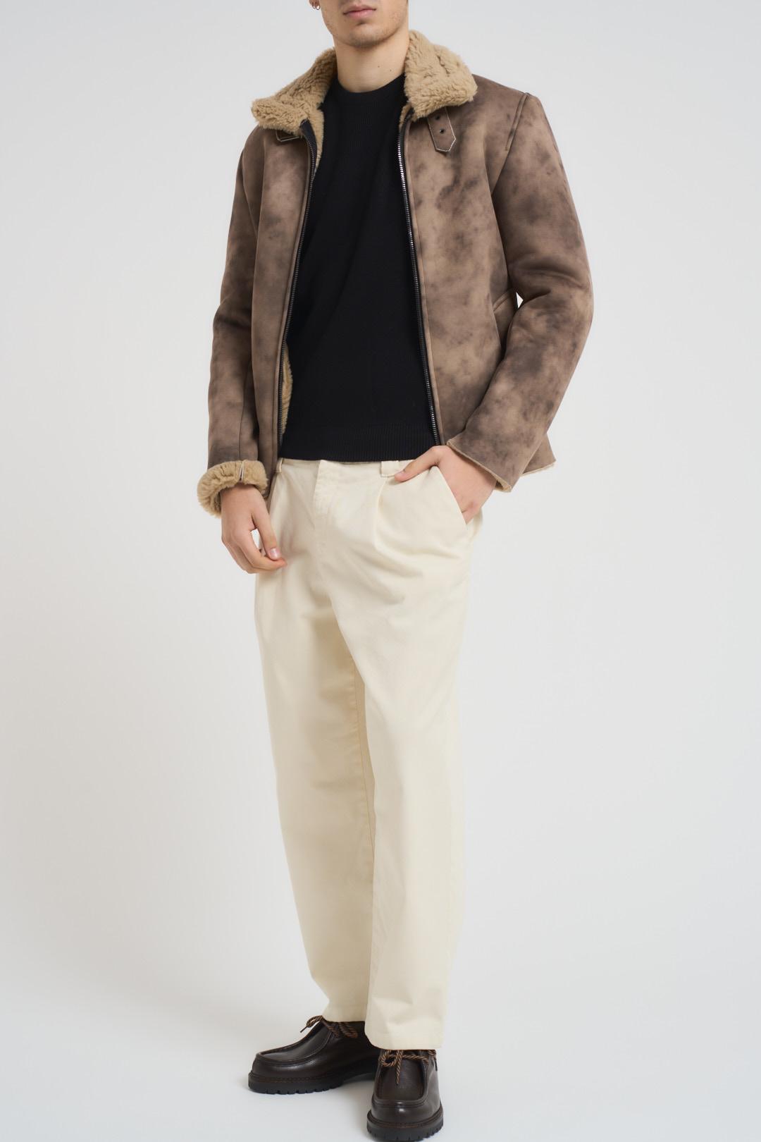 BERNA Giubbotto uomo ecomontone marrone. Modello con colletto, orlo ed interno in pelliccia sintetica beige. tessuto con effetto sfumato. Chiusura centrale con zip metallica e cinturino regolabile altezza collo. Tasche taglio americano sul fronte e fondo dritto. Composizion: 100% poliestere. Il modello è alto 190cm e indossa la taglia L.