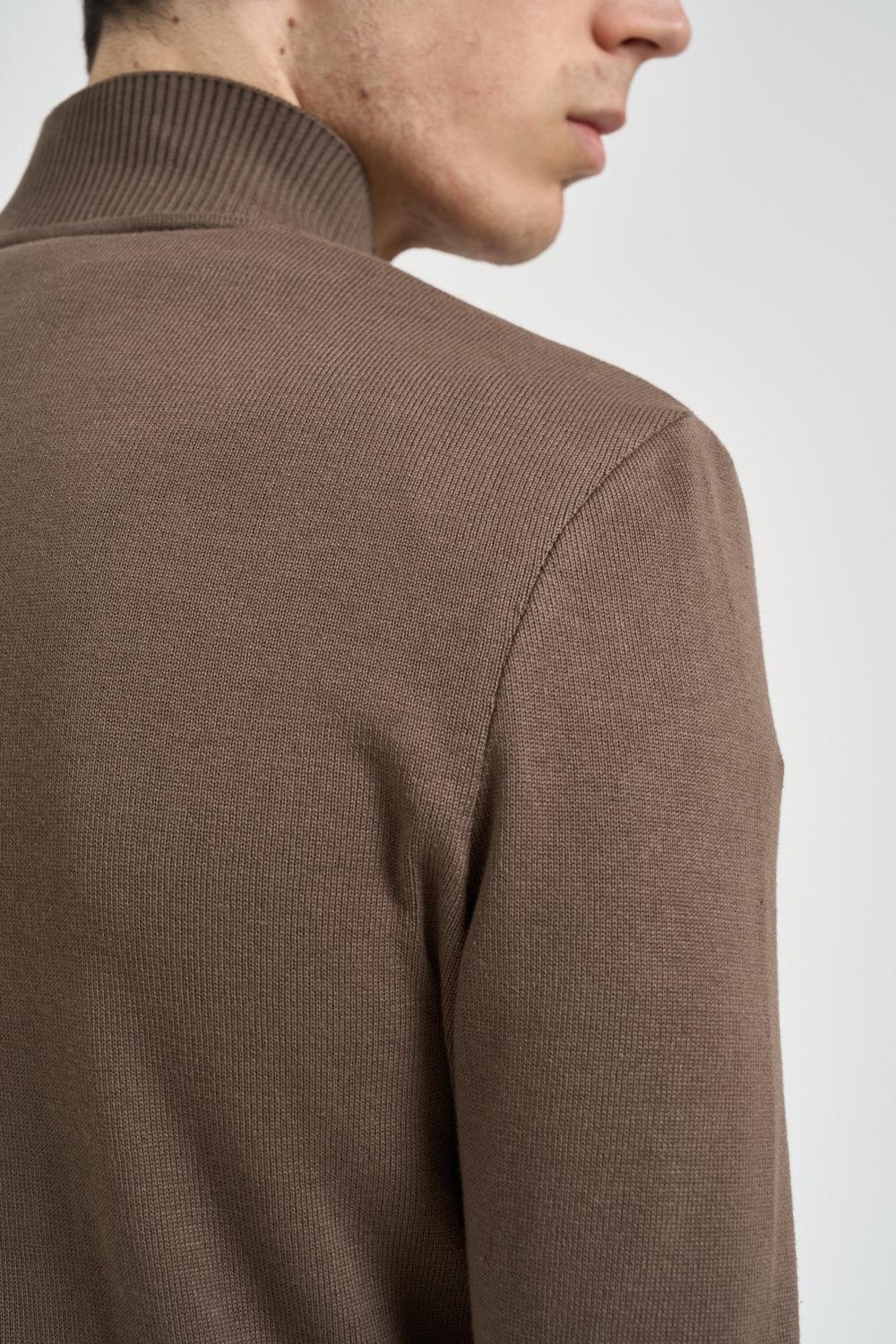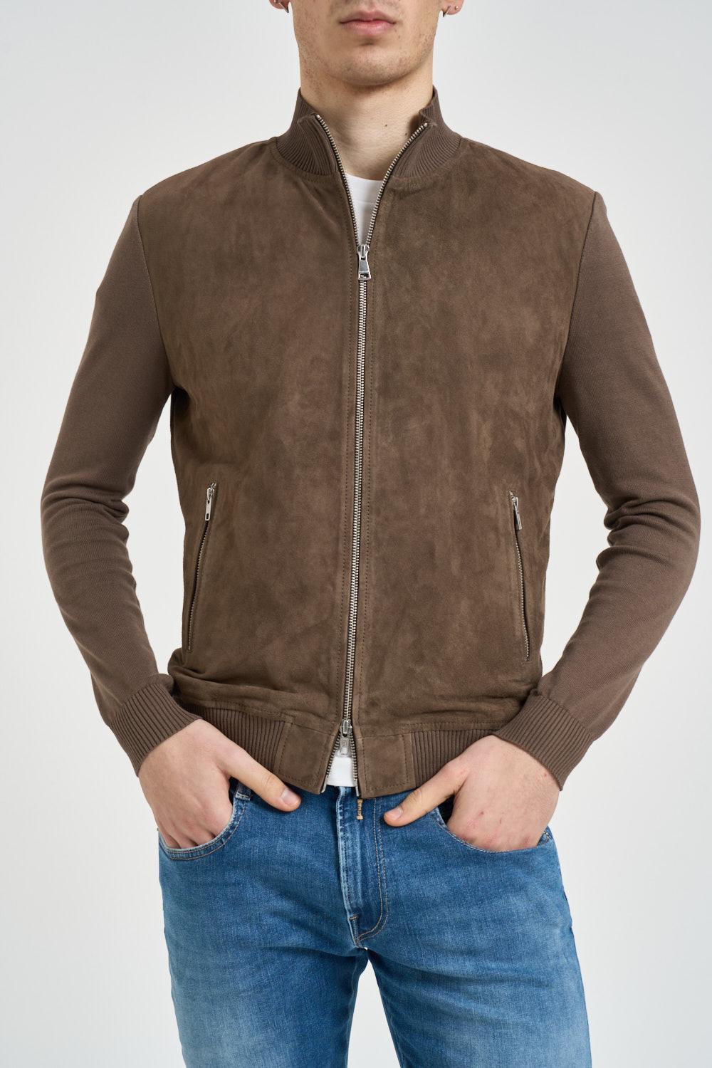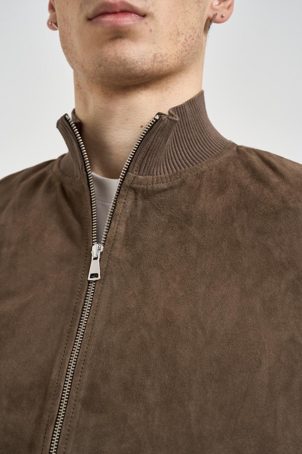 BOMBOOGIE Giubbotto uomo in camoscio fango. Modello co chiusura a zip. Tasche laterali a filetto con zip. Collo, fondo e polsini in tessuto a costine. Composizione: 100% pelle. Fodera: 100% cotone. Il modello è alto 190cm e indossa la taglia L.