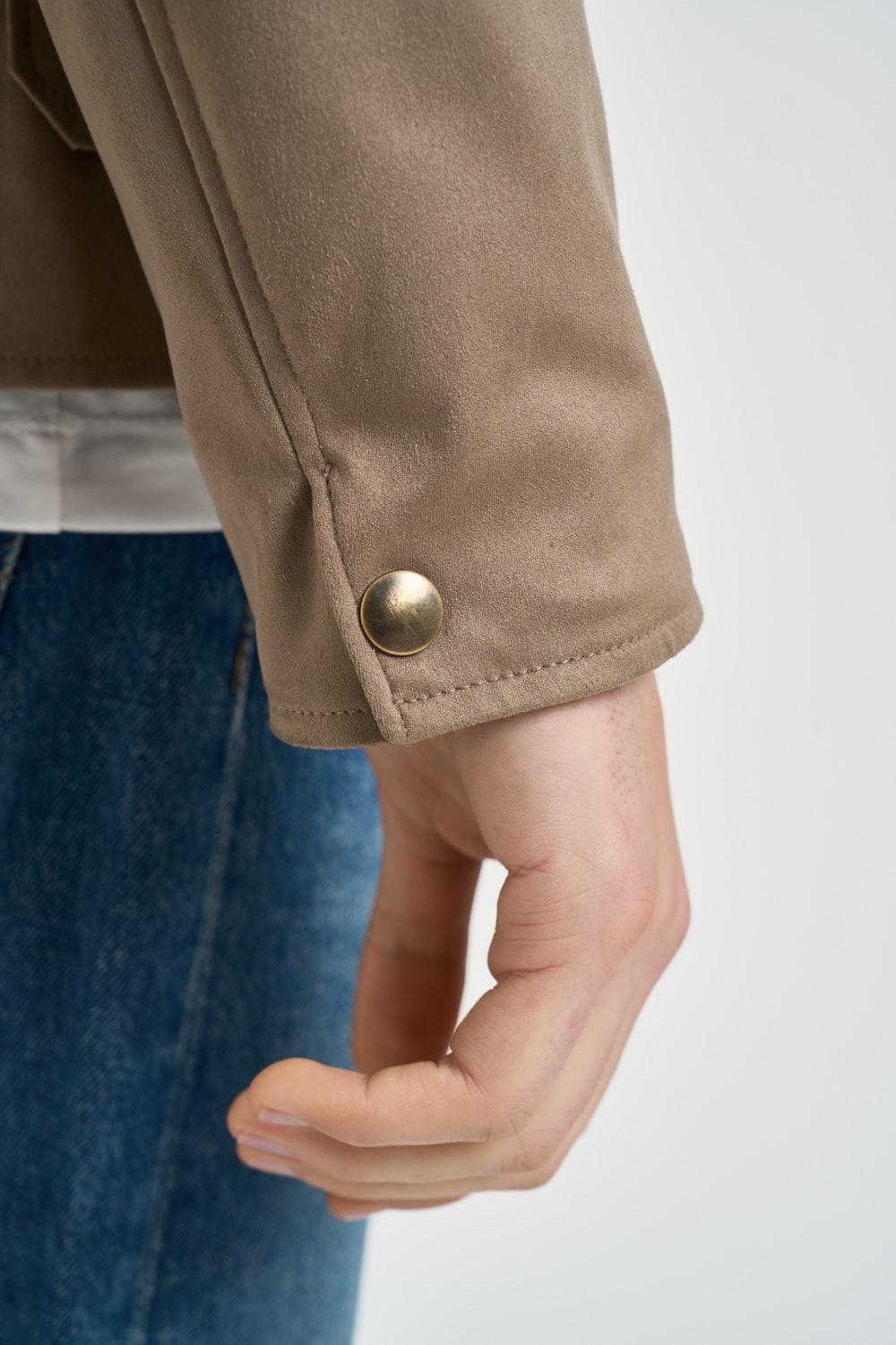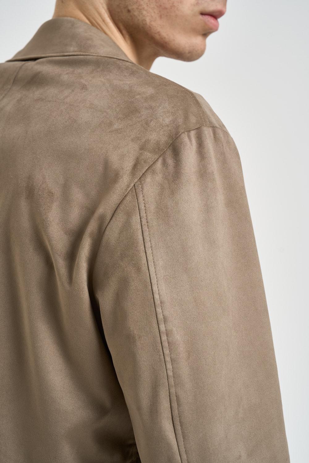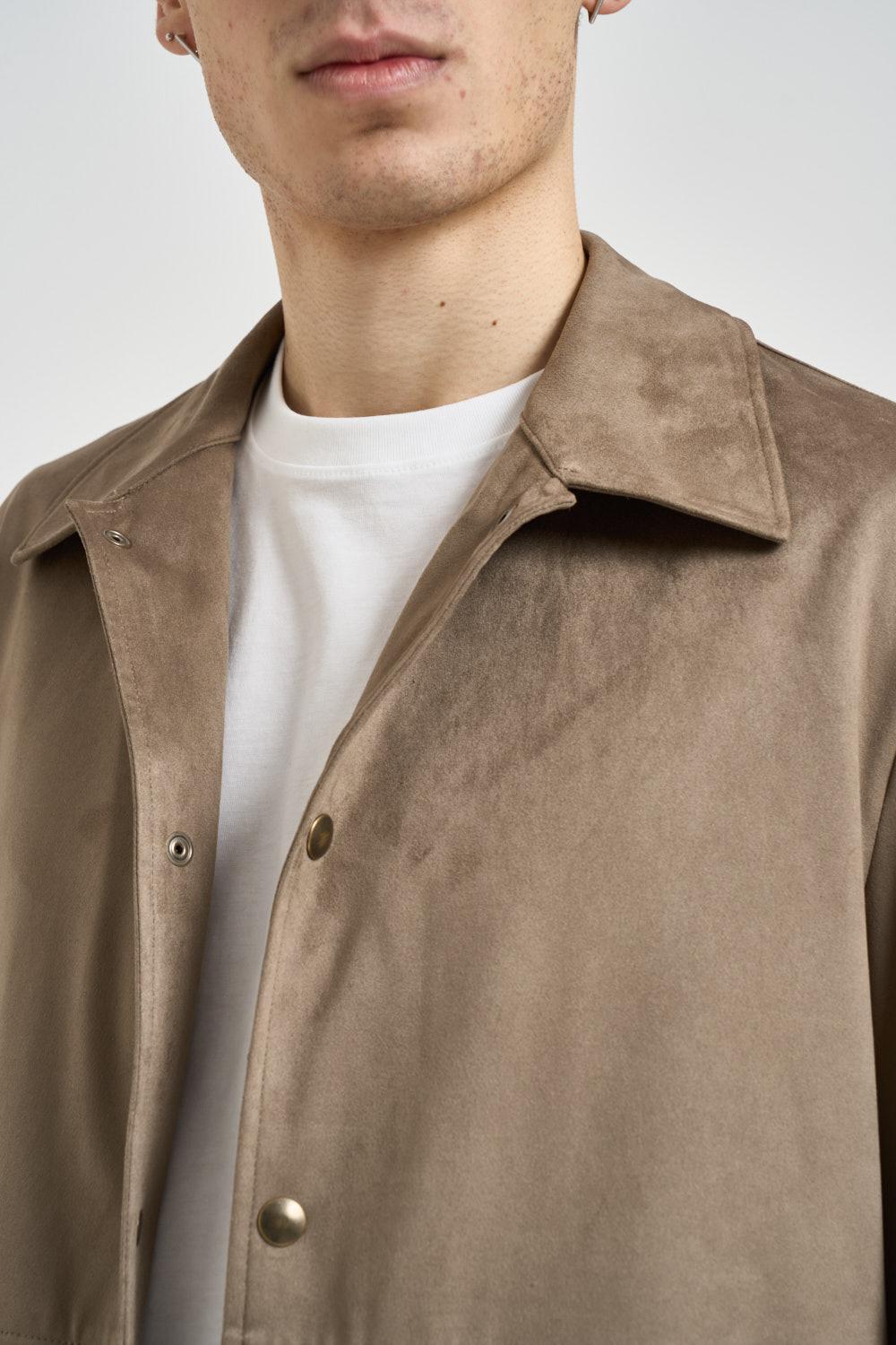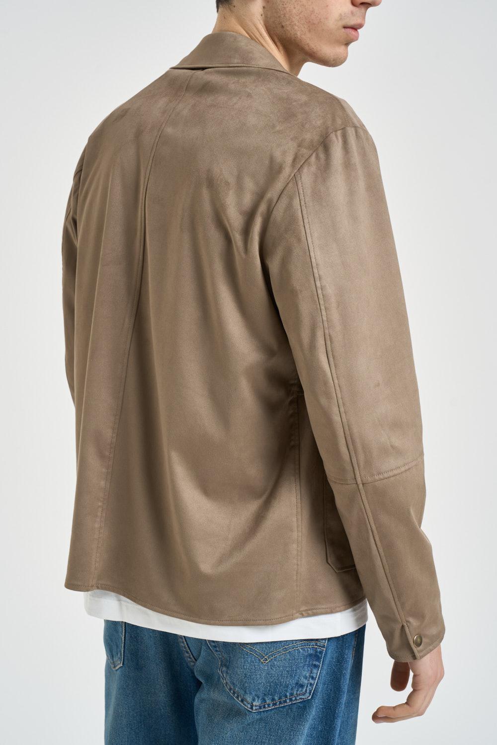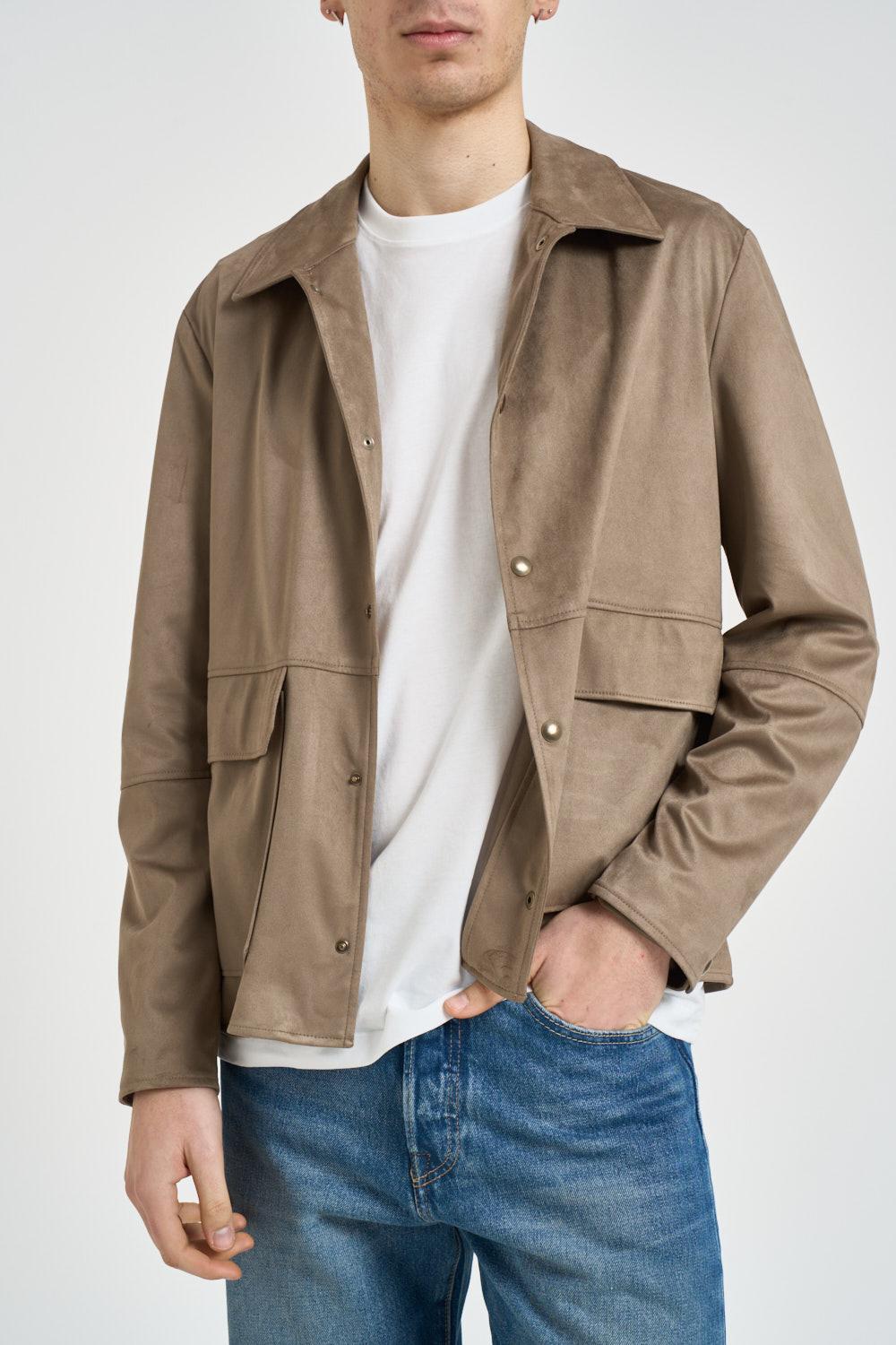 ALTA TENSIONE Giubbotto uomo in pelle scamosciata fango. Modello in stile camicia. Manica lunga. Colletto classico. Tasche con patta frontali. Chiusura frontale con bottoni a pressione. Bottoni su fondo manica. Composizione: 92% poliestere, 8% elastane. Il modello è alto 190cm e indossa la taglia L.