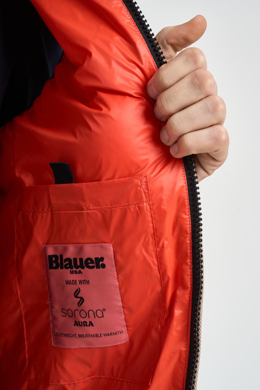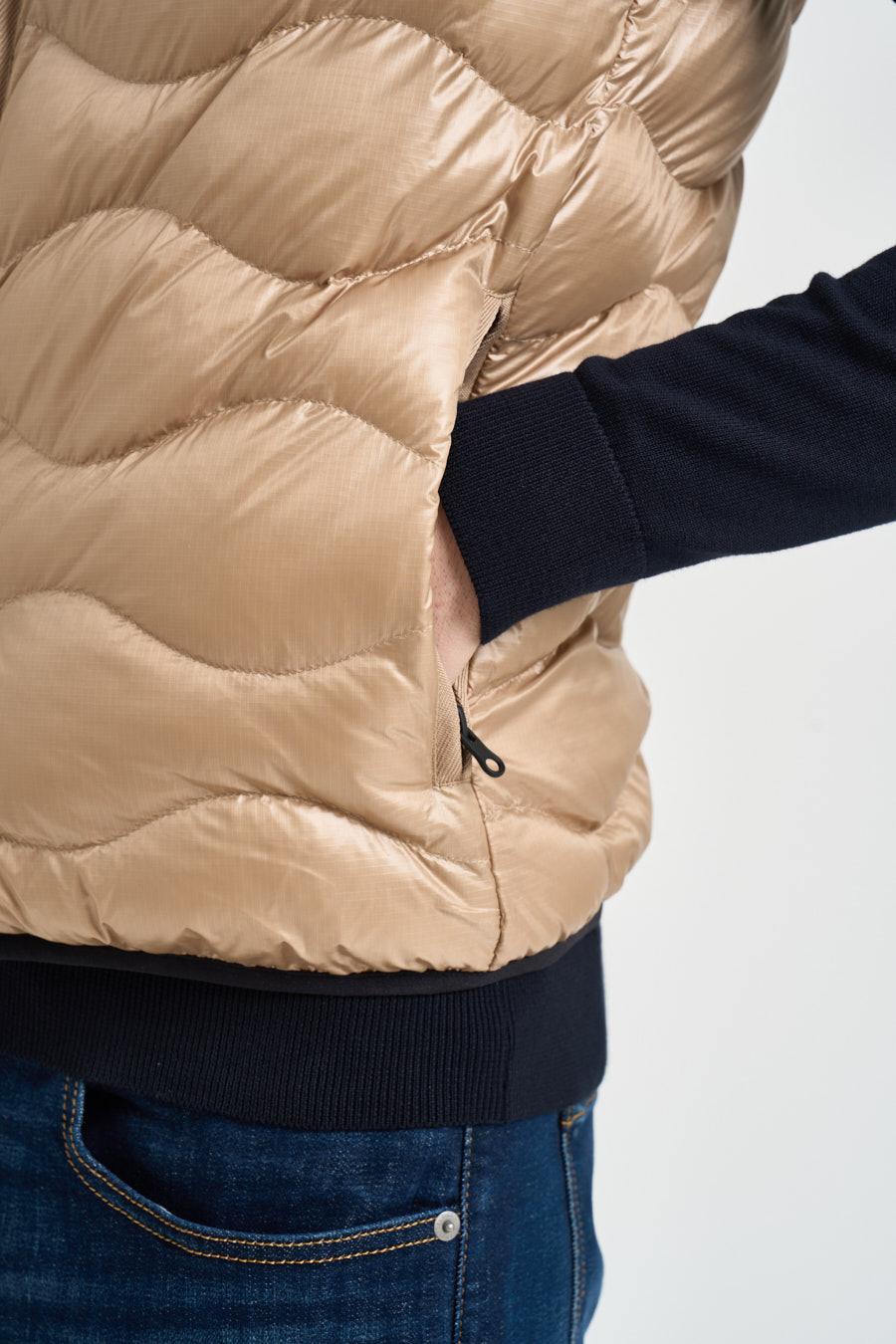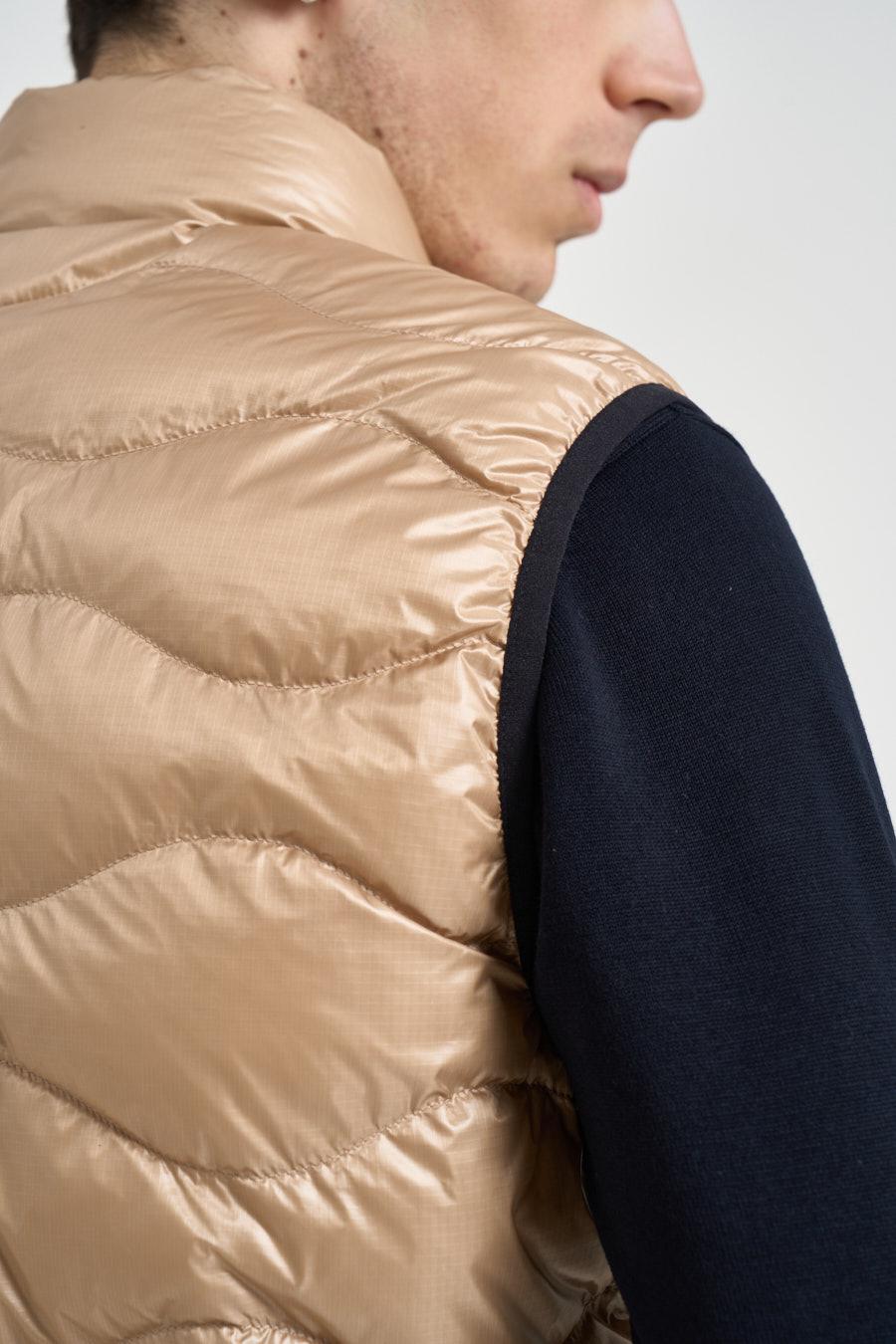 BLAUER Giubbotto uomo smanicato beige. Modello imbottito, leggero e versatile, caratterizzato da una trapuntatura orizzontale. Il capo presenta un collo alto. Chiusura frontale con zip. Tasche laterali con zip. Composizione: 100% poliammide. Il modello è alto 190 cm e indossa la taglia L.