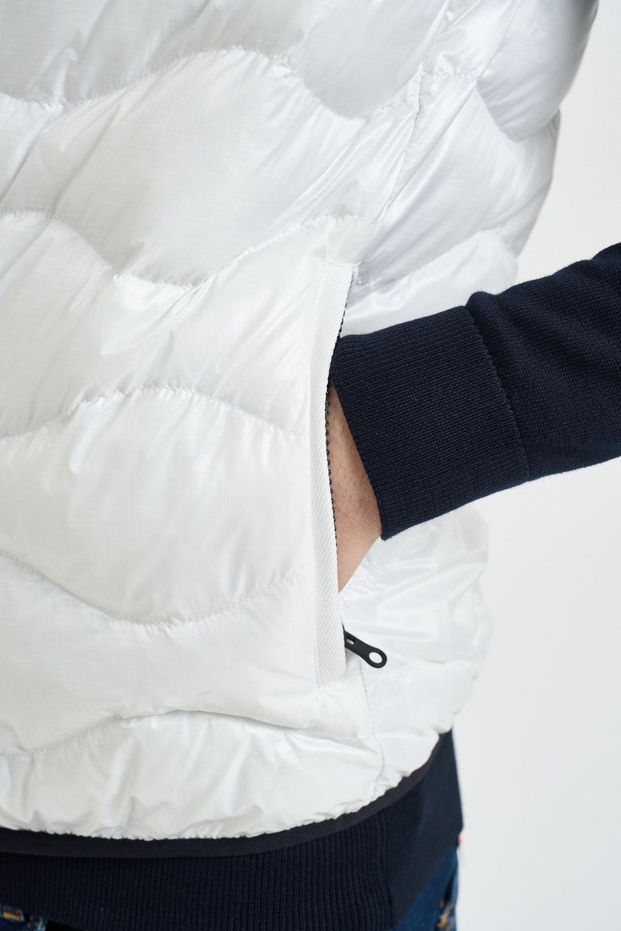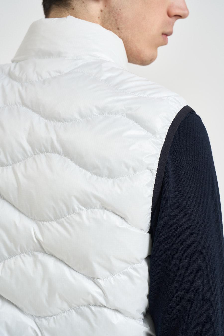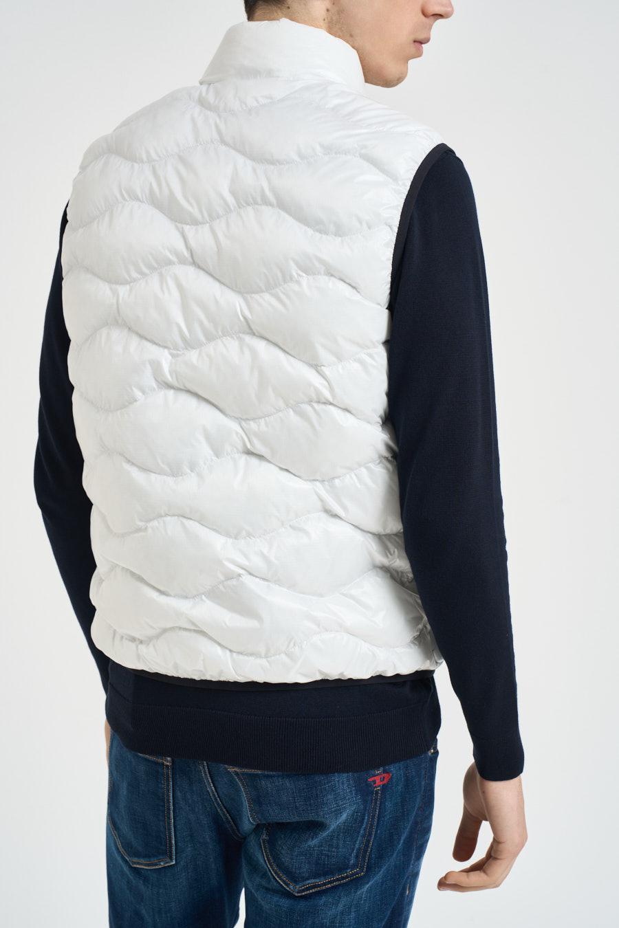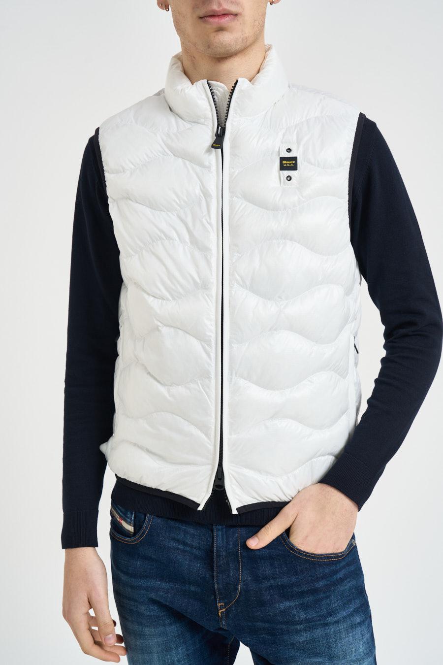 BLAUER Giubbotto uomo smanicato bianco. Modello imbottito, leggero e versatile, caratterizzato da una trapuntatura orizzontale. Il capo presenta un collo alto. Chiusura frontale con zip. Tasche laterali con zip. Composizione: 100% poliammide. Il modello è alto 190 cm e indossa la taglia L.