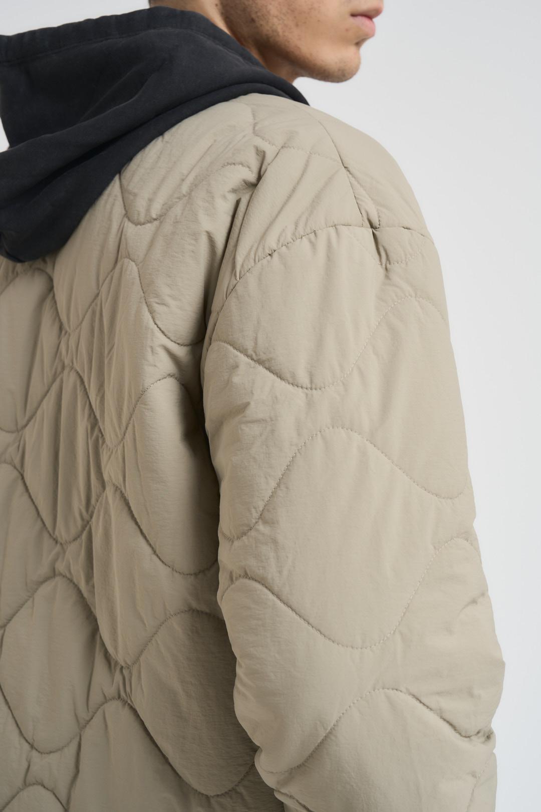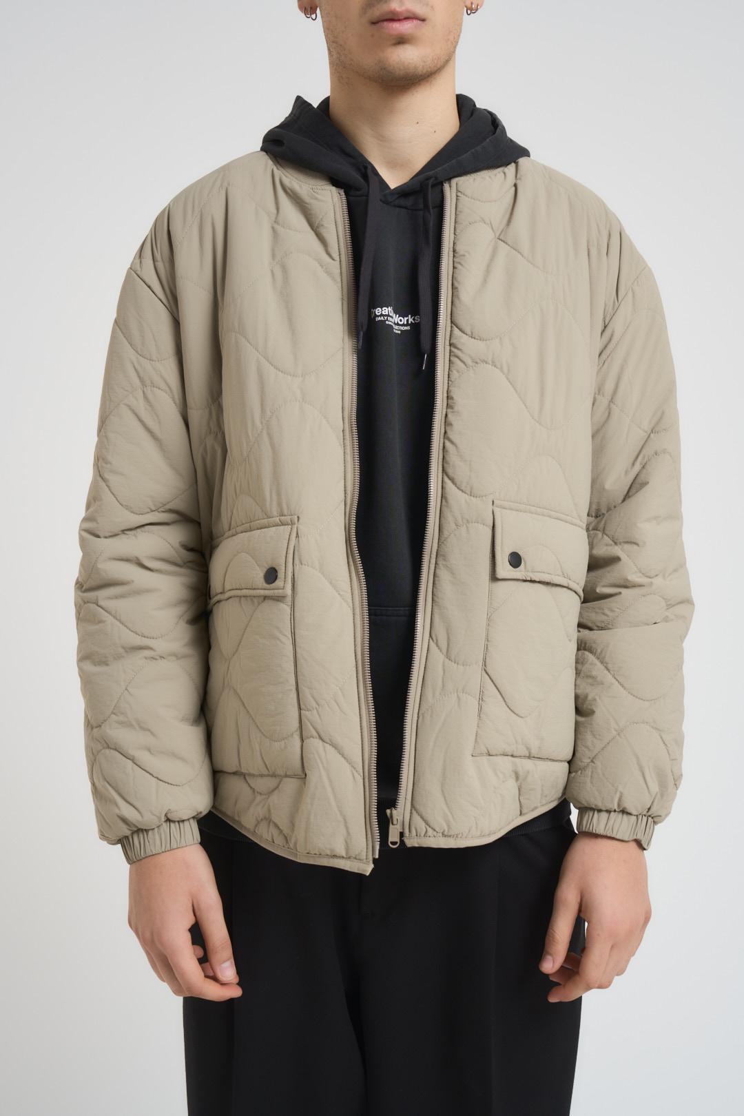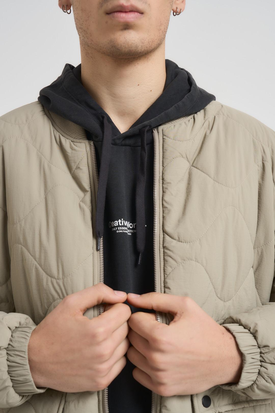 ONLY&SONS Giubbotto uomo trapuntato grigio chiaro. Modello girocollo con dettaglio a costine elastico, maniche lunghe con polsini a punto smock. Chiusura a zip. Due tasche frontali a patta e bottoncini. Composizione: 100% nylon. Il modello è alto 190cm e indossa la taglia L.