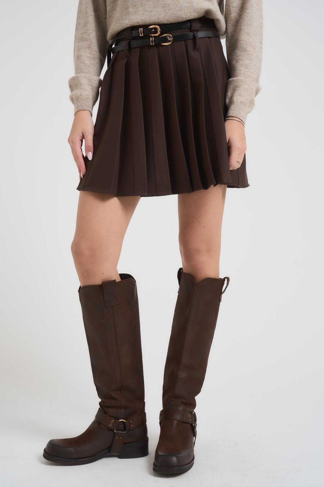 KIKISIX Gonna donna a pieghe moro. Modello con doppi passanti in vita e doppia cintura. Chiusura con zip laterale. Composizione: 63% poliestere, 34% viscosa, 3% elastane. La modella è alta 172 cm e indossa la taglia S.
