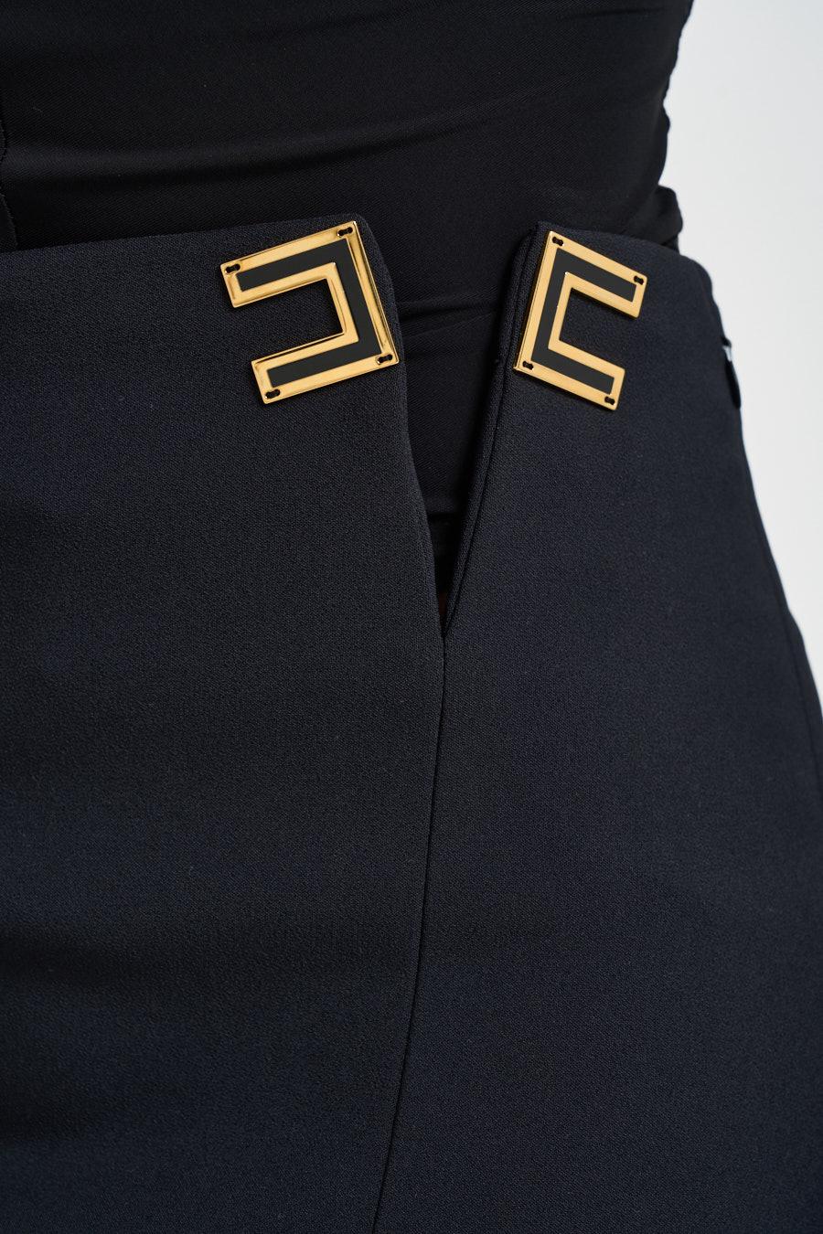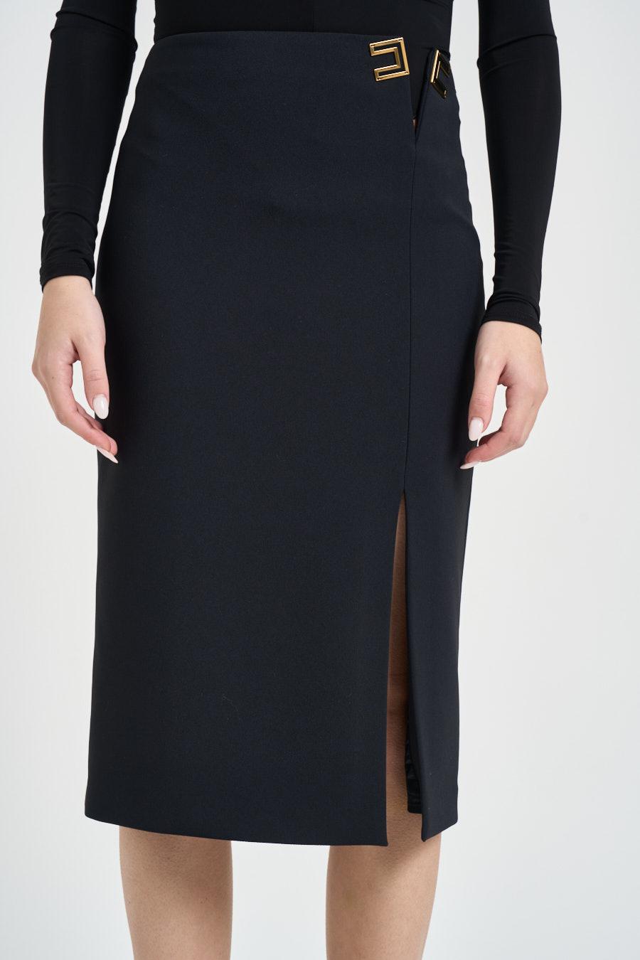 ELISABETTA FRANCHI Gonna donna a tubo nera. Modello con spacco. Logo dorato. Chiusura con cerniera laterale. Composizione: 96% poliestere, 4% elastane. Fodera: 97% poliestere 3% elastane. La modella è alta 172 cm e indossa la taglia 40.