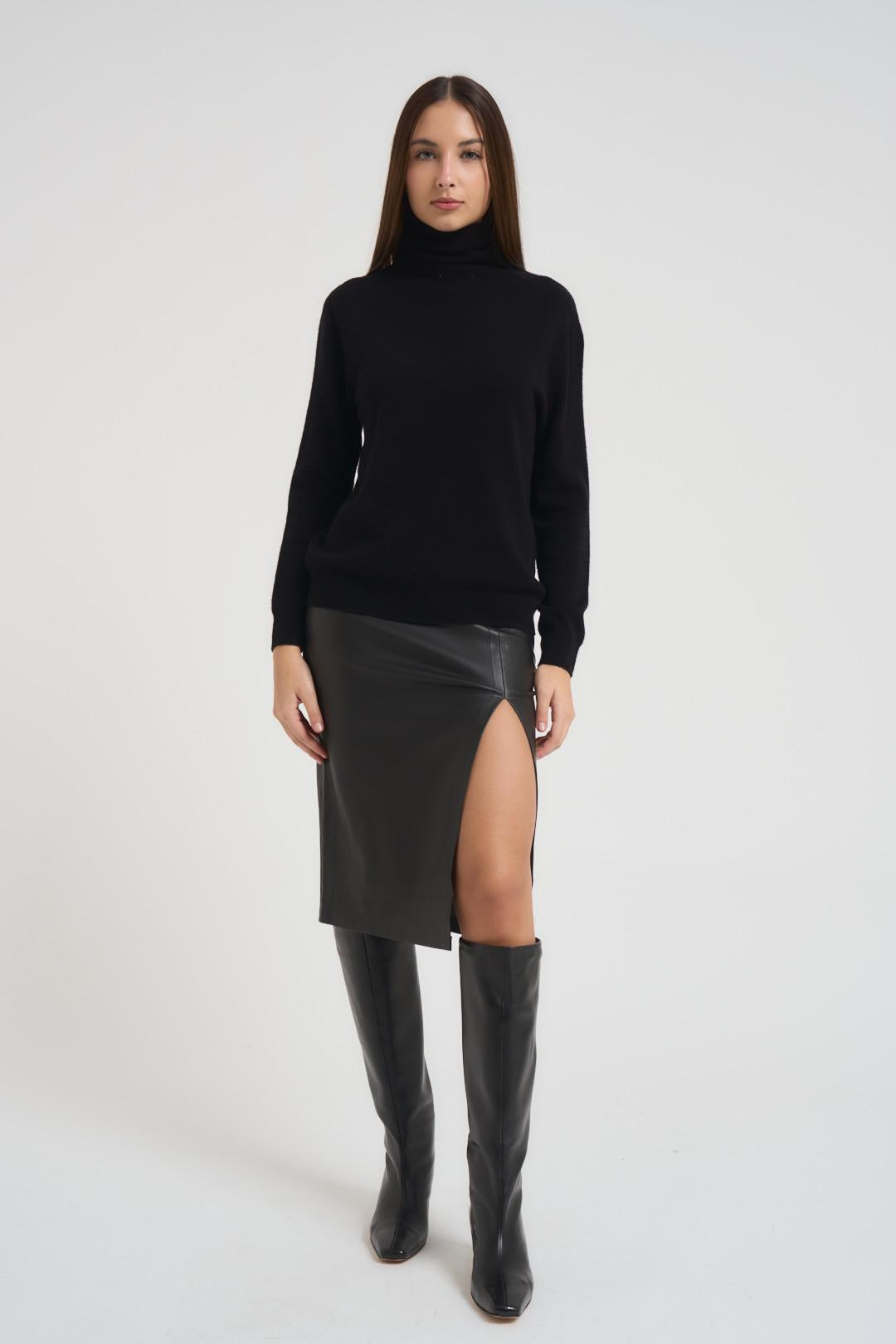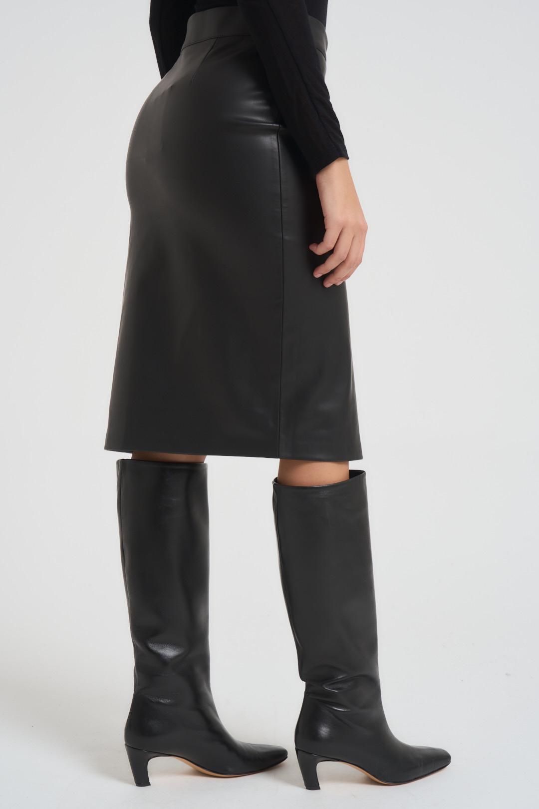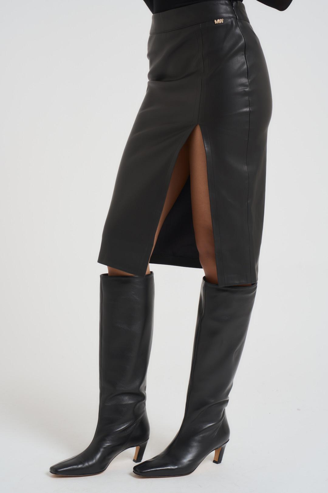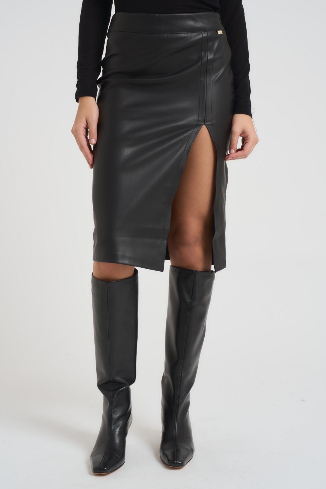 MARKUP Gonna donna in ecopelle. Modello con spacco profondo, vestibilità aderente, chiusura con zip. Colore: nero. La modella è alta 176cm e indossa la tg 40.