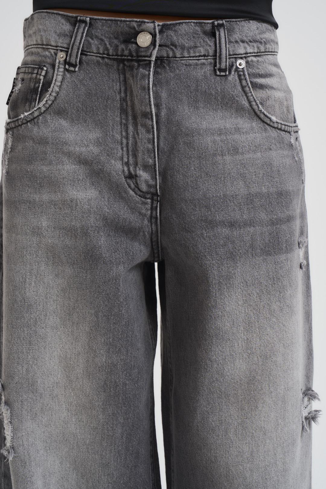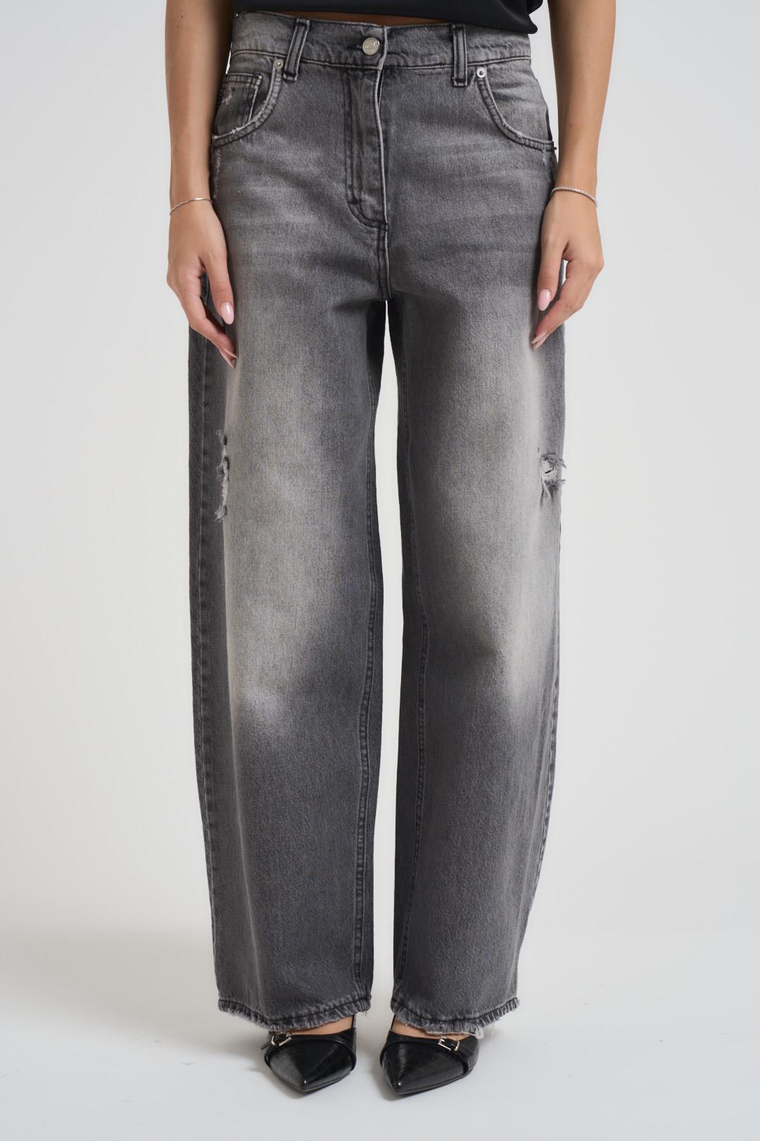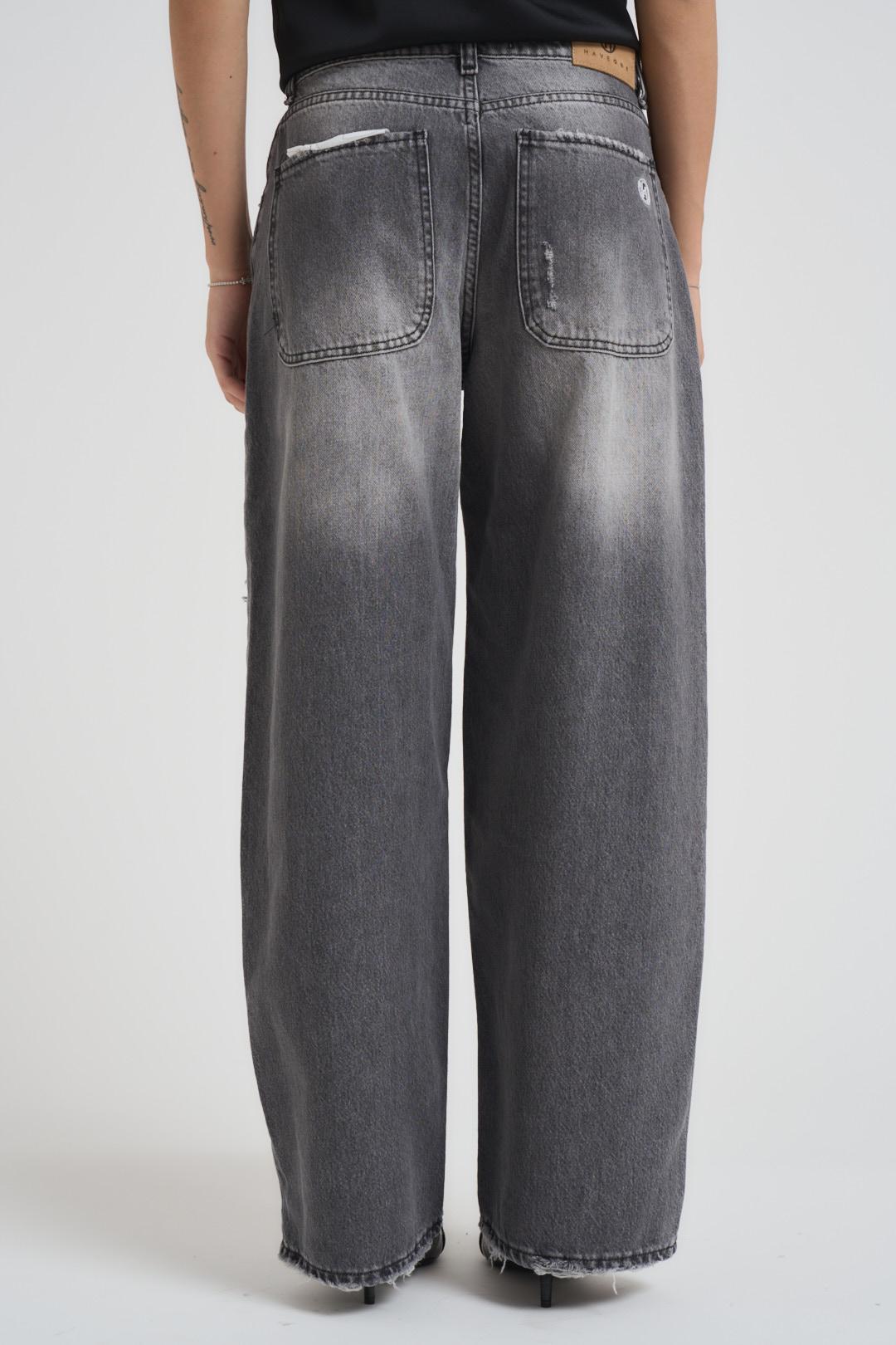 HAVEONE Jeans donna a palazzo in denim grigio chiaro. Modello a cinque tasche chiusura con zip e bottone, rotture sulla gamba. Composizione: cotone. La modella è alta 172 cm e indossa la taglia S.