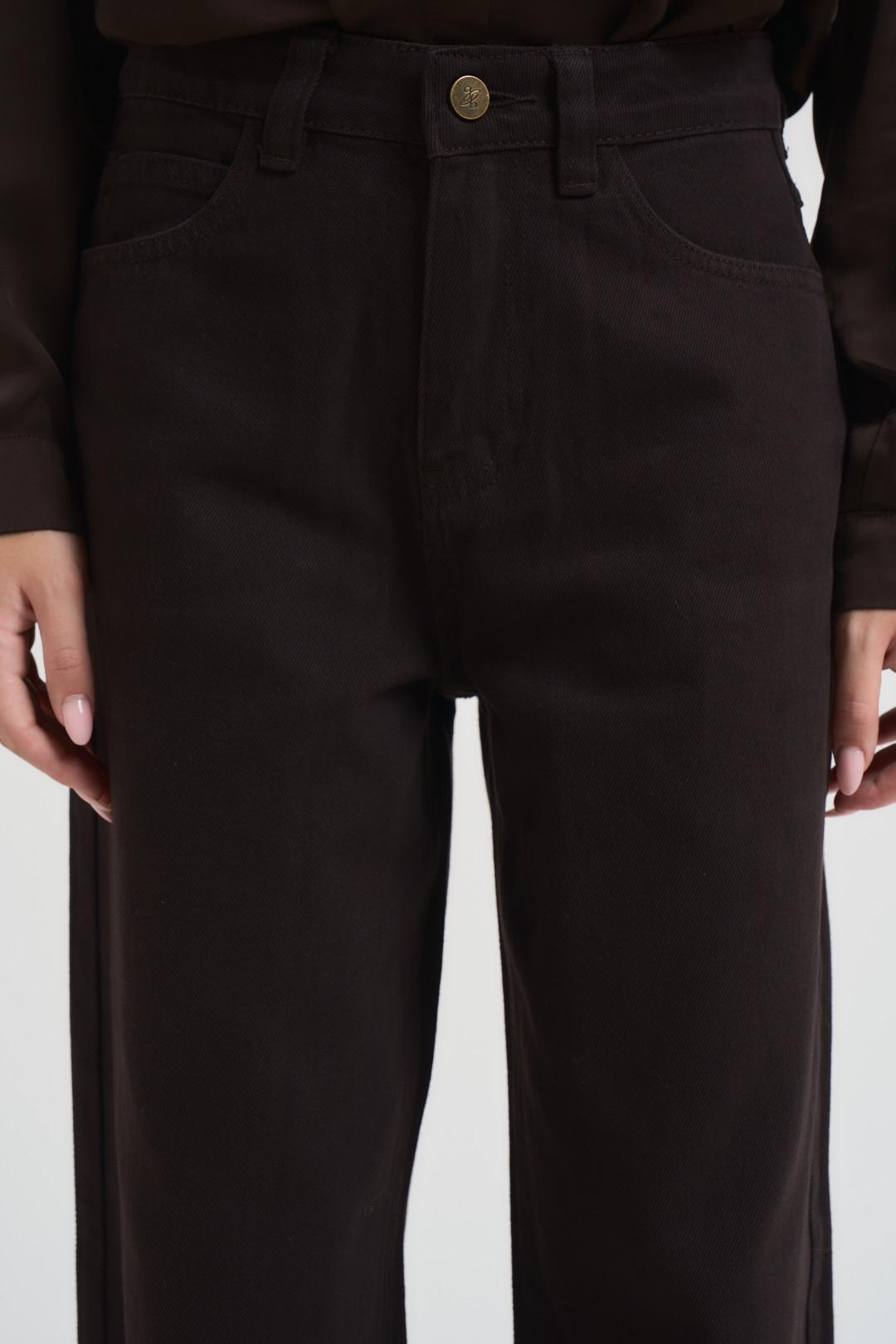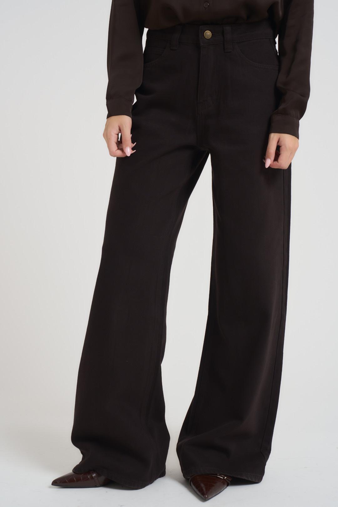 GRACE AND MILA Jeans donna a palazzo in denim marrone. Modello a cinque tasche, chiusura con zip e bottone, passanti in vita. Composizione: cotone. La modella è alta 172 cm e indossa la taglia 26.