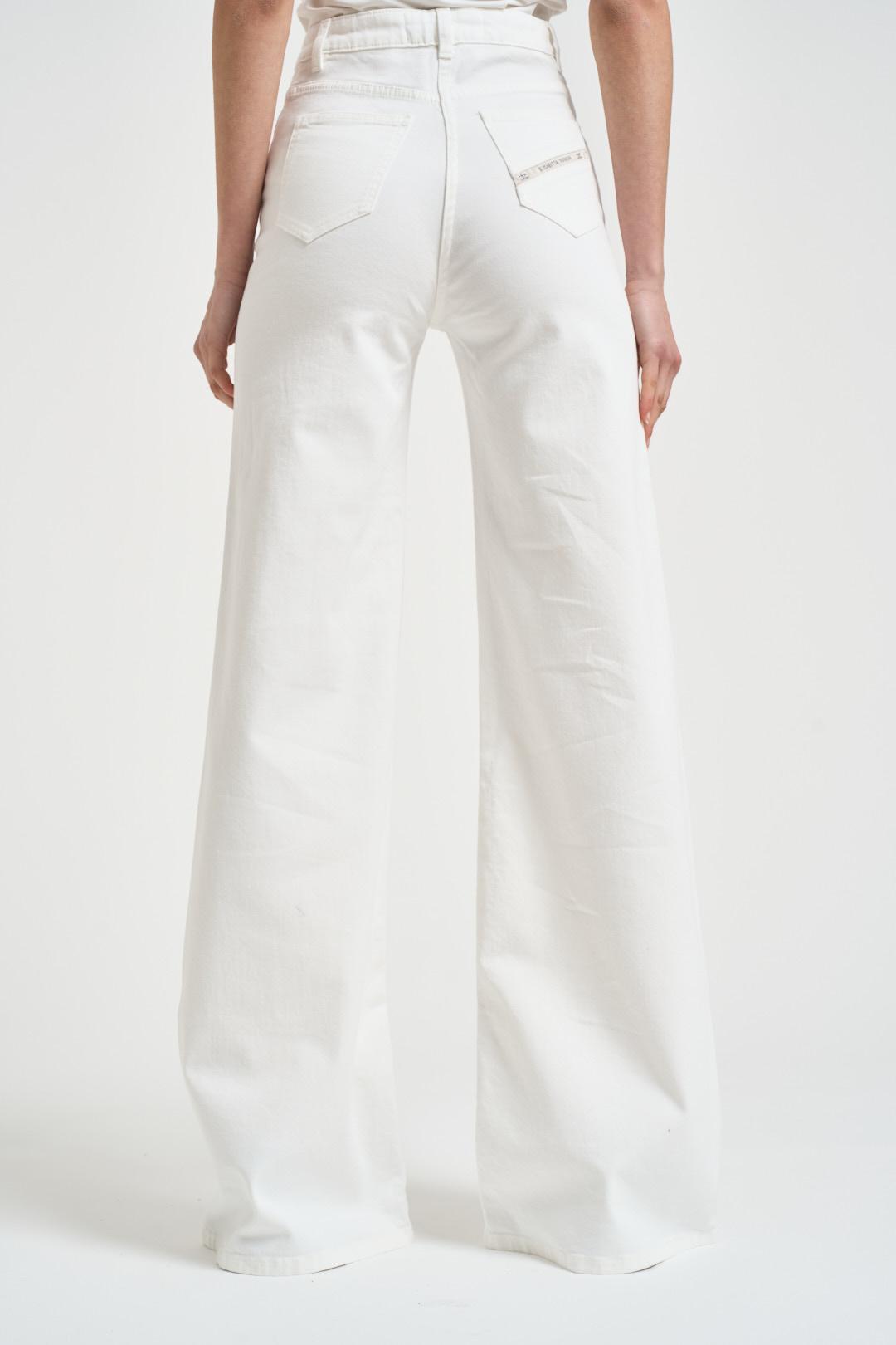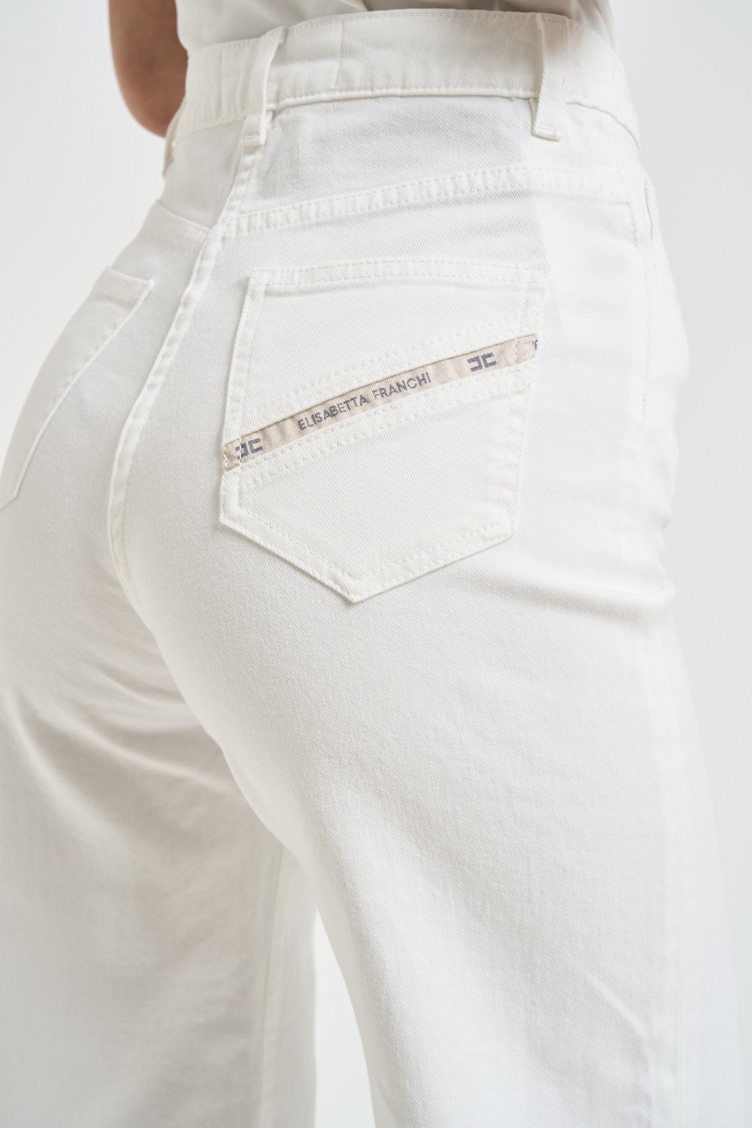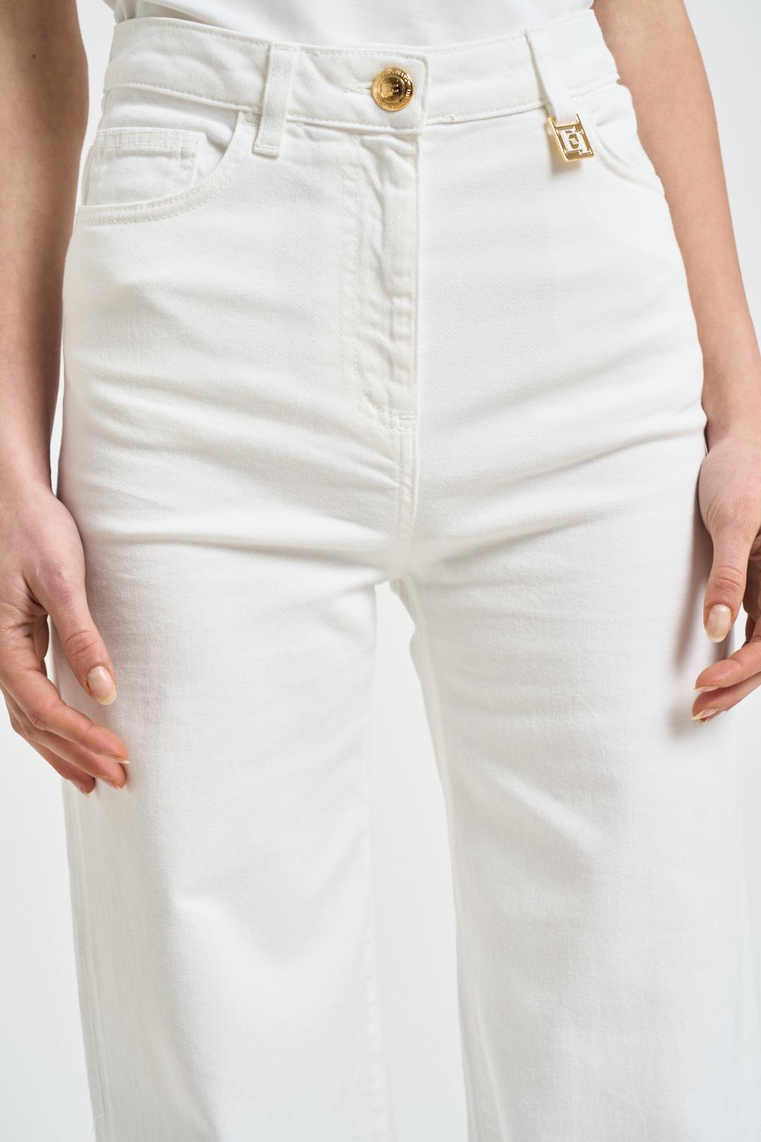 ELISABETTA FRANCHI Jeans donna a zampa bianchi. Modello a vita alta, wide leg con gamba ampia e linea fluida, pensato per slanciare la silhouette. Chiusura frontale con zip e bottone gioiello dorato con logo, passanti in vita e classiche cinque tasche. Sul davanti è presente un charm con logo EF applicato al passante, mentre sul retro spicca letichetta con logo Elisabetta Franchi applicata sulla tasca. Finiture pulite e fondo dritto. Composizione: 100% Cotone. La modella è alta 176 cm e indossa la taglia 25.