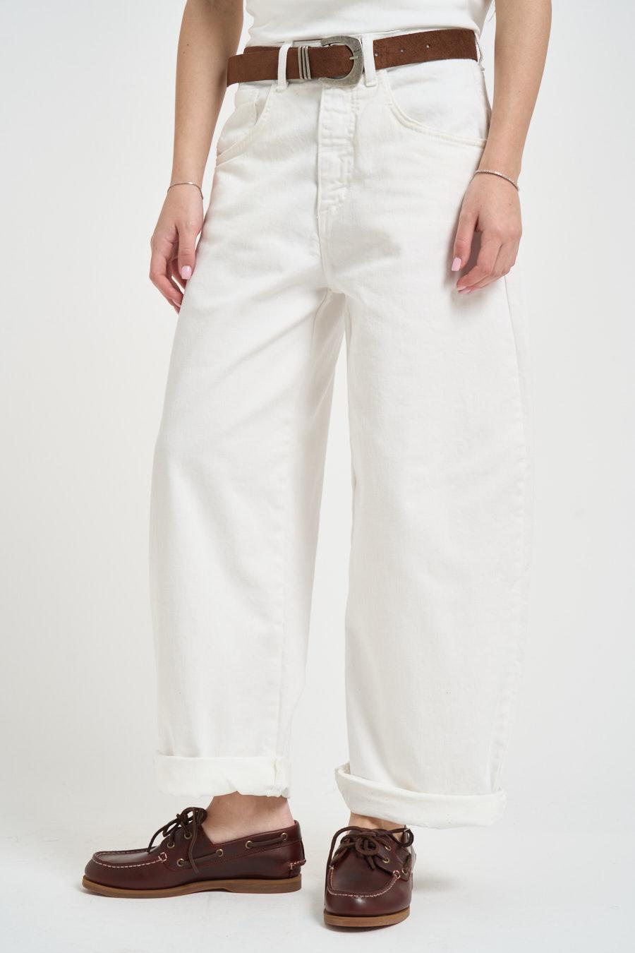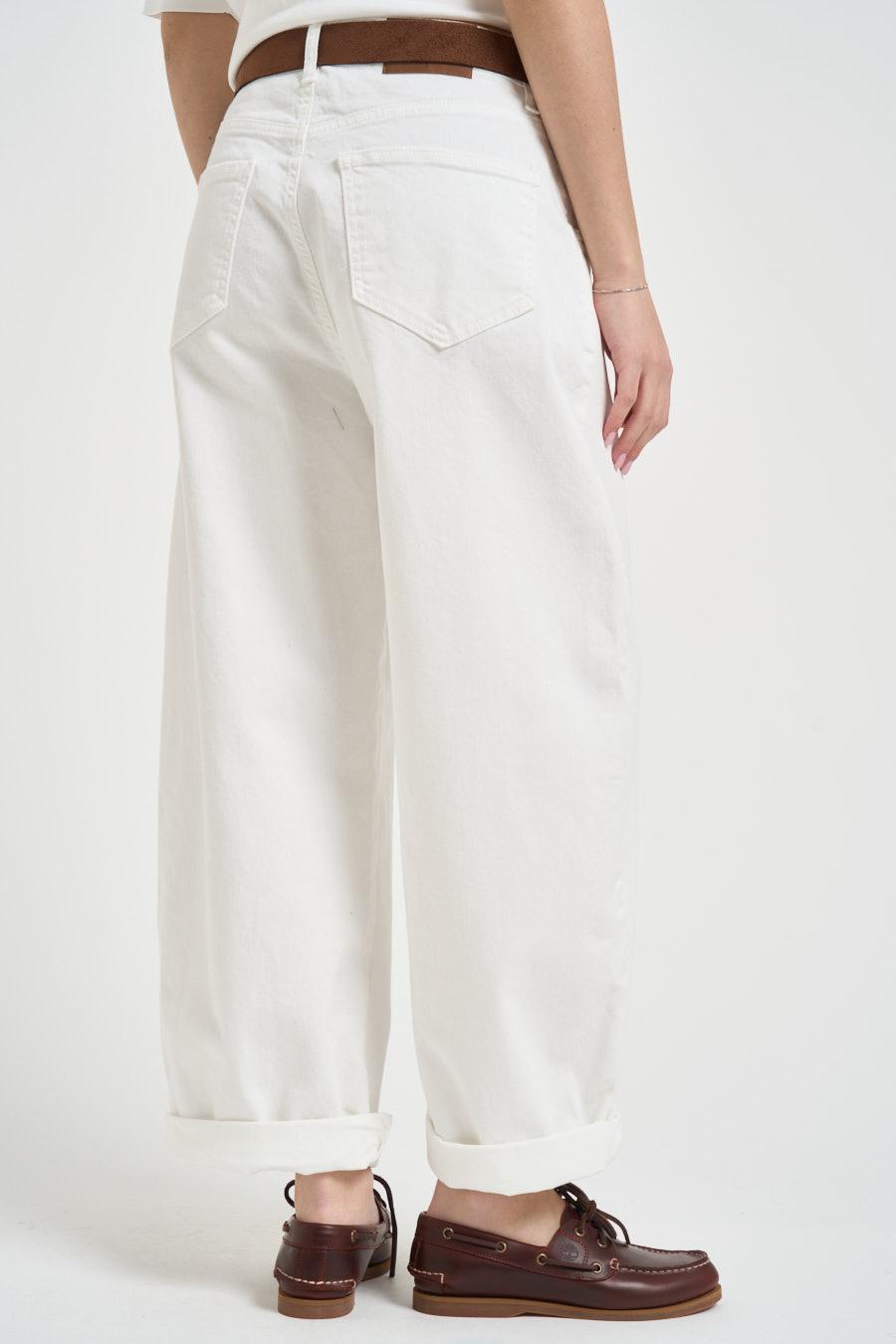 PHILIA LOFT Jeans donna balloon in denim bianco. Modello con chiusura frontale con cerniera e bottone. Passanti in vita. Cinque tasche. Composizione: 98% cotone, 2% elastane. La modella è alta 172 cm e indossa la taglia XS.