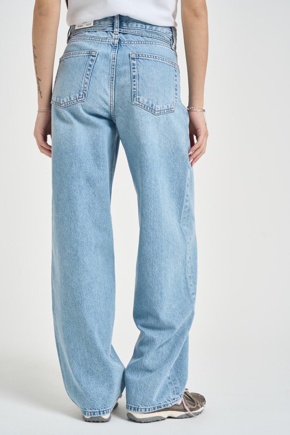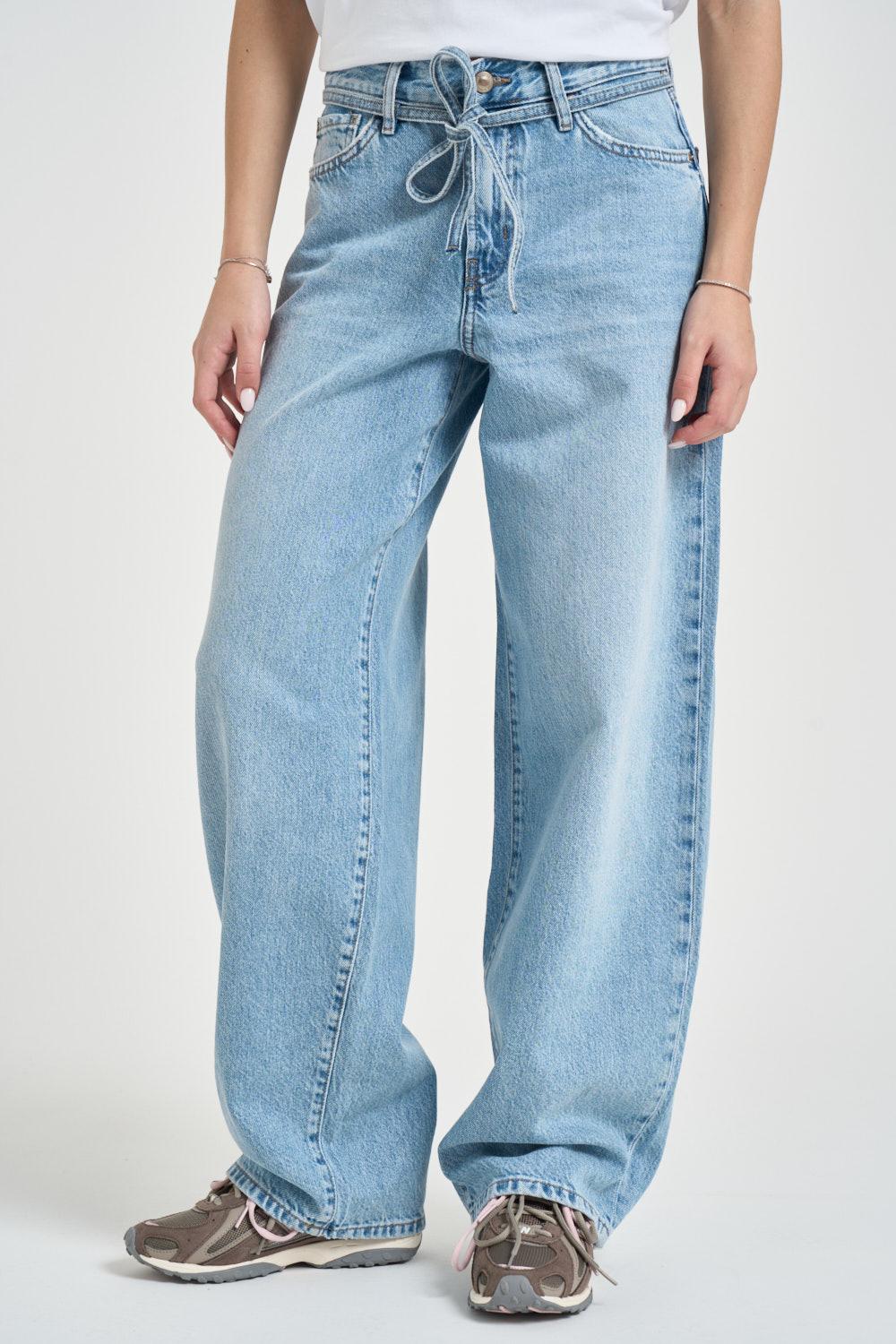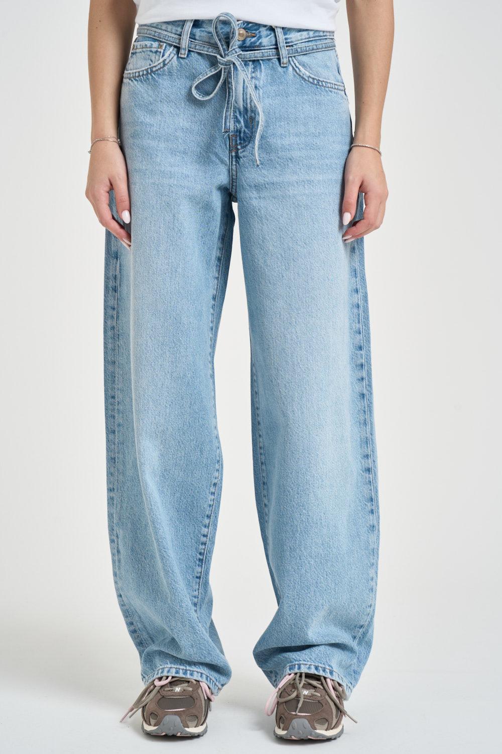 ONLY NOOS Jeans donna balloon in denim blu chiaro. Modello a vita alta con gamba ampia e linea dritta, caratterizzato da coulisse regolabile in vita che aggiunge un dettaglio casual e funzionale. Chiusura frontale con bottone e zip. Design cinque tasche con tasche anteriori e posteriori applicate. Fondo dritto. Composizione: 100% cotone. La modella è alta 172 cm e indossa la taglia 25.