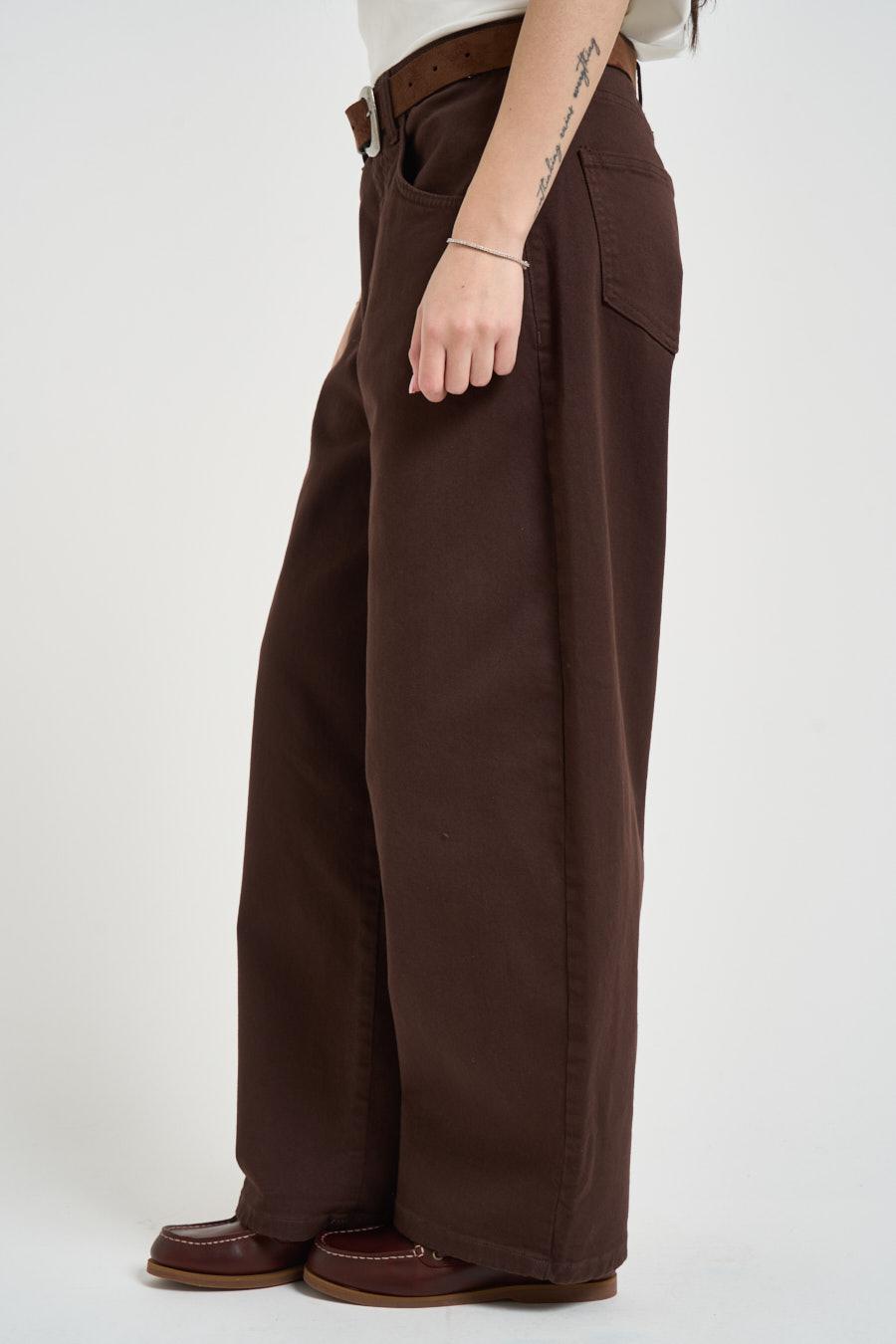 PHILIA LOFT Jeans donna balloon marrone. Modello con chiusura frontale con cerniera e bottone. Passanti in vita. Cinque tasche. Composizione: 98% cotone, 2% elastane. La modella è alta 172 cm e indossa la taglia XS.