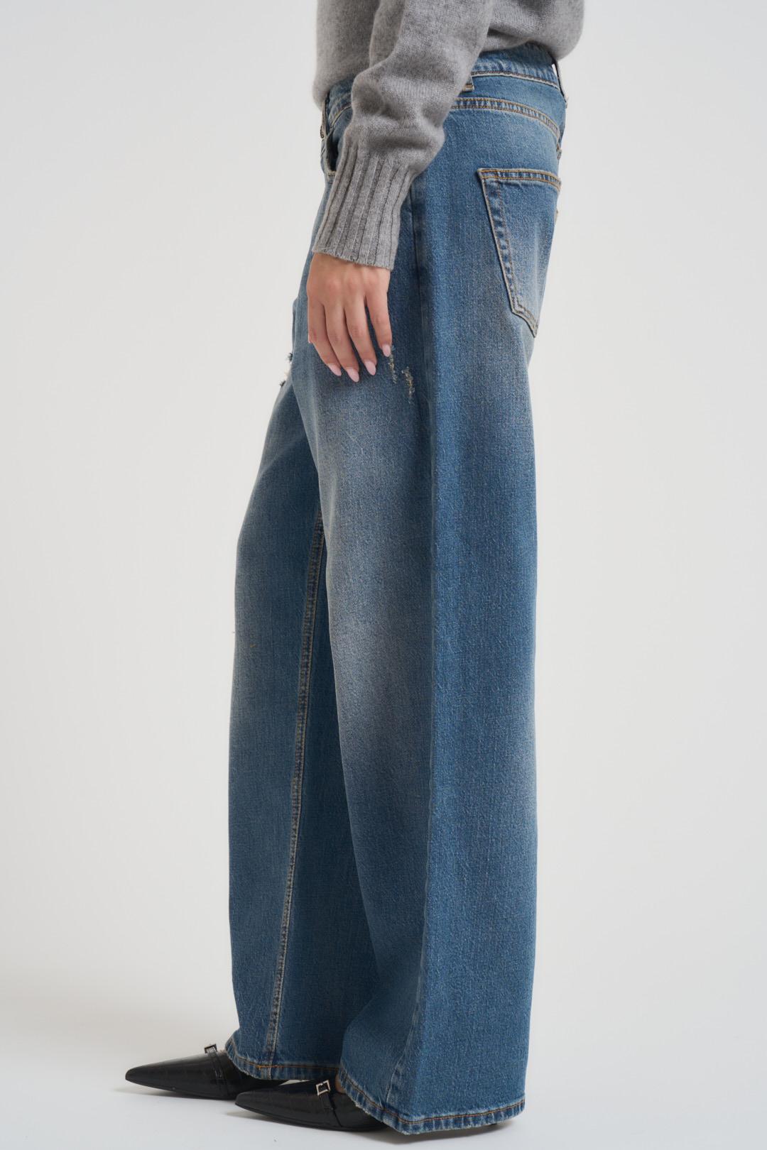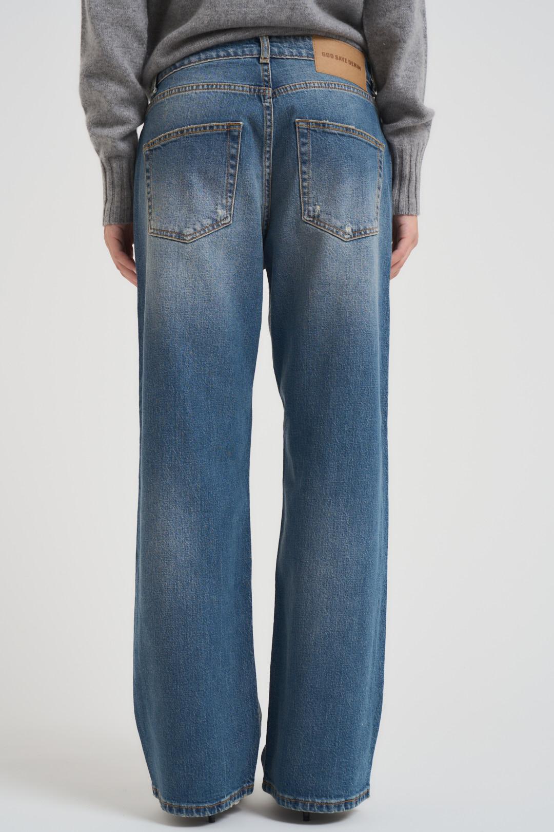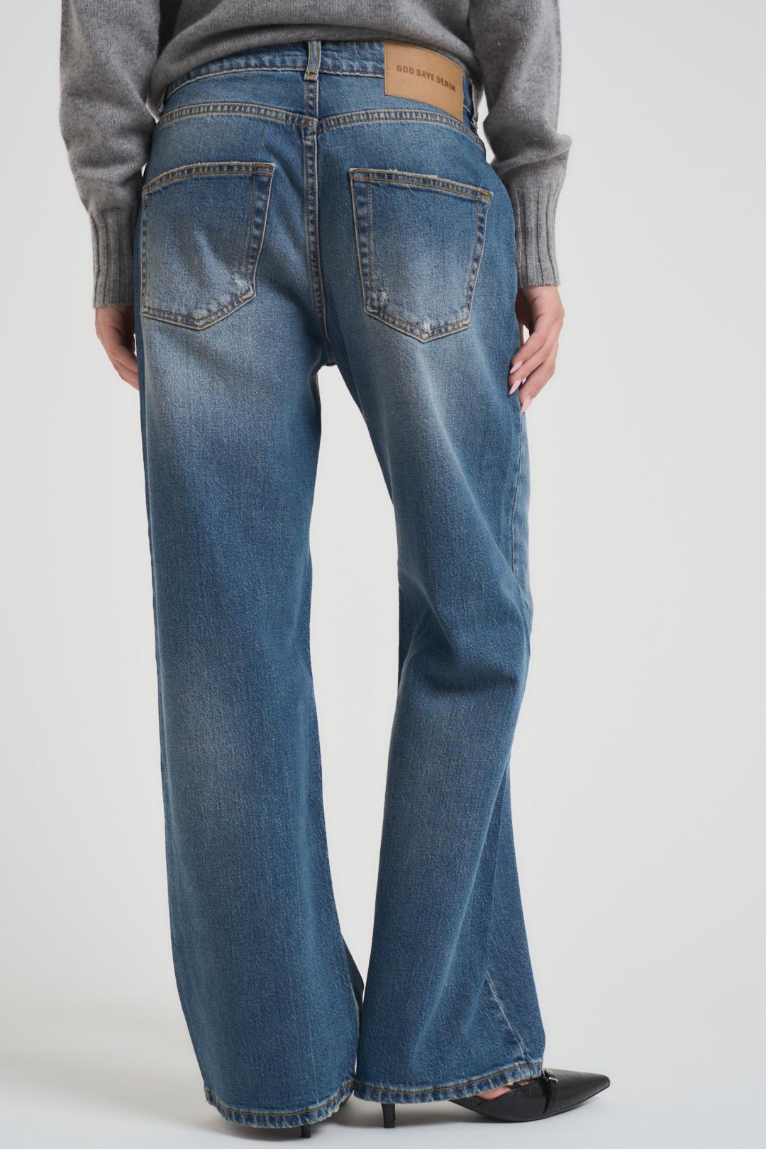 GOD SAVE DENIM Jeans donna gamba dritta denim chiaro. Modello a 5 tasche, chiusura frontale con zip e bottone, rotture gamba destra. Composizione: 100% cotone. La modella è alta 172 cm e indossa la taglia 40.