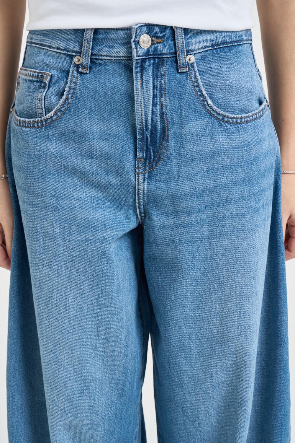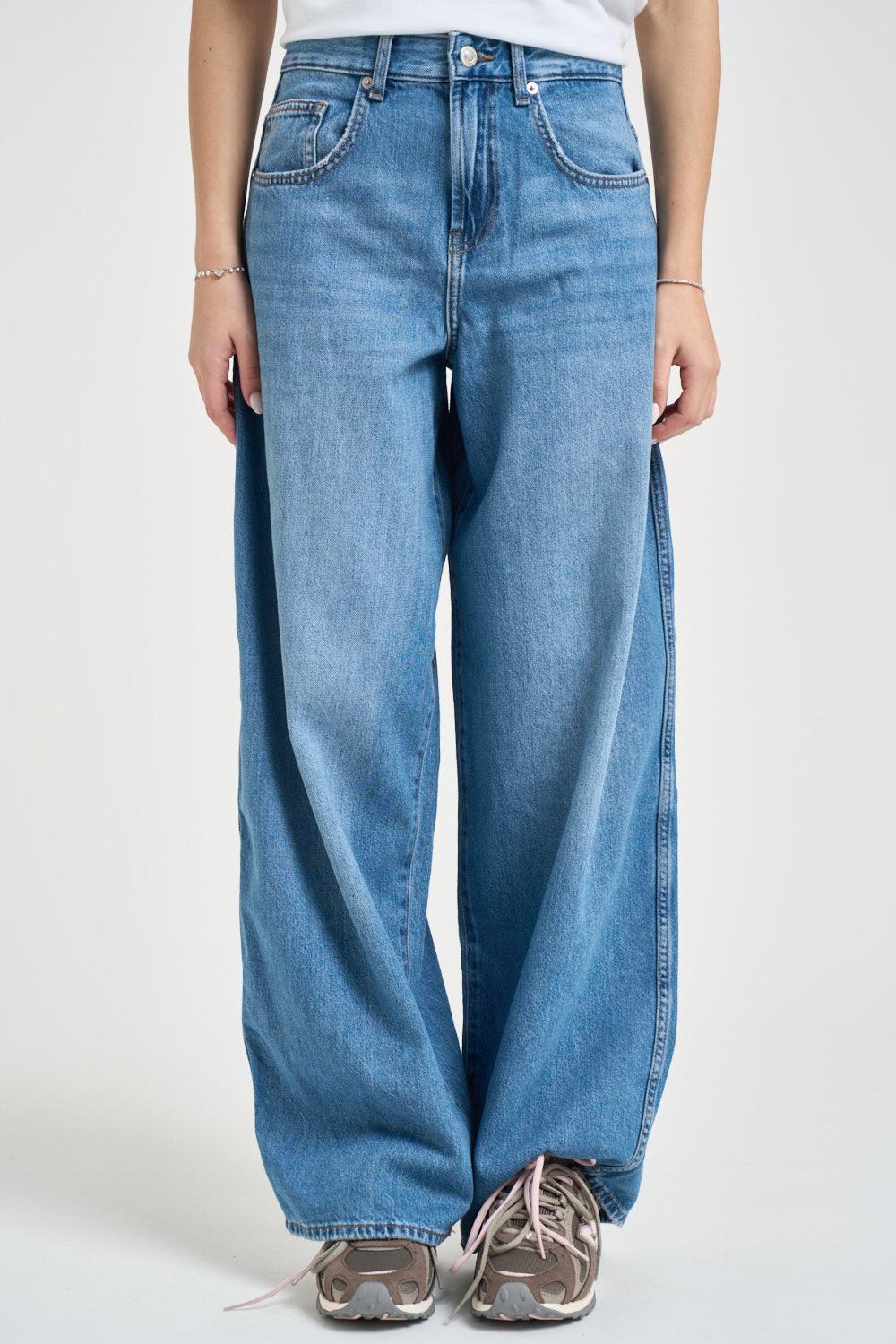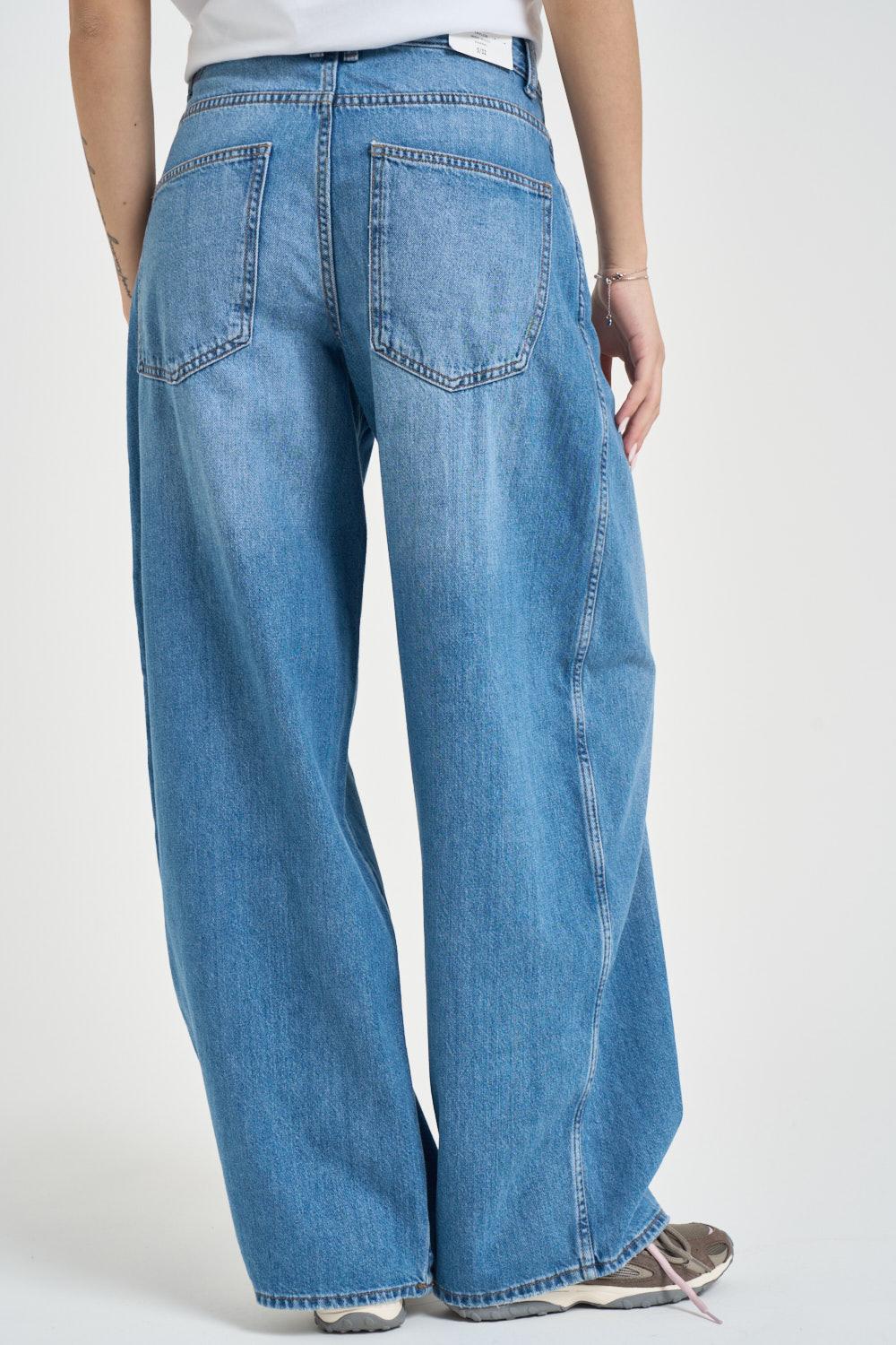 ONLY NOOS Jeans donna largo in denim blu. Modello a vita alta con vestibilità ampia e gamba larga, chiusura frontale con bottone e zip. Design cinque tasche con passanti in vita e cuciture a contrasto. Composizione: 100% cotone. La modella è alta 172cm e indossa la taglia S.