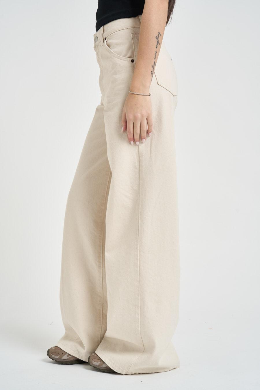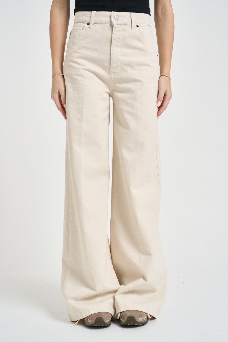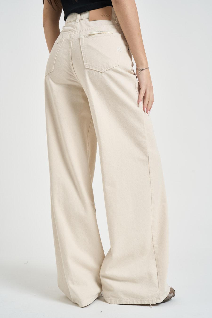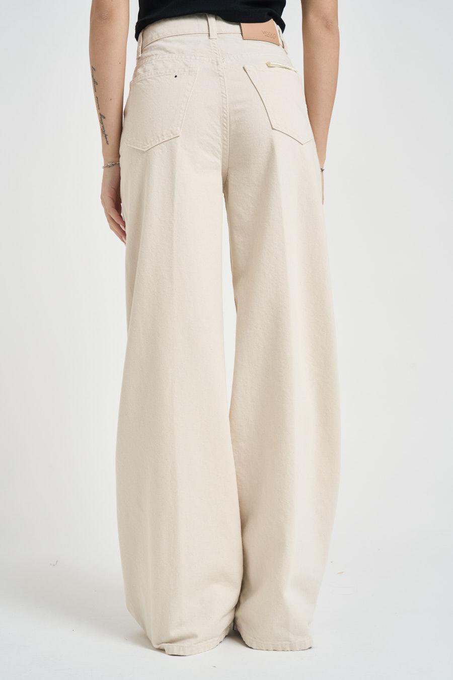VICOLO Jeans donna Lexie in denim ecru. Modello wide leg a vita alta con chiusura con bottone metallico e zip a scomparsa. Modello a cinque tasche. Composizione: 98% cotone 2% elastan. La modella è alta 172cm e indossa la taglia S.