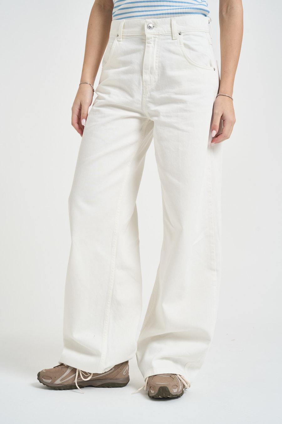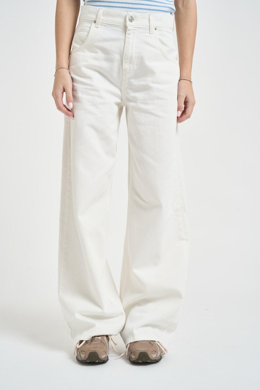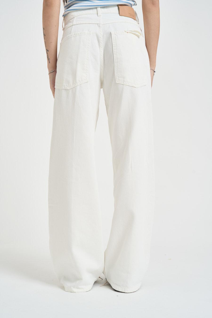 VICOLO Jeans donna Mia in denim bianco. Modello baggy fit a gamba dritta, cinque tasche con chiusura frontale tramite zip e bottone. Composizione: 100% cotone. La modella è alta 172cm e indossa la taglia S.