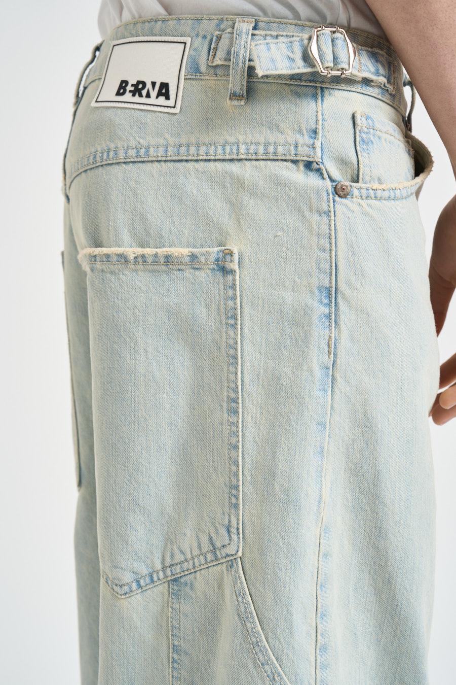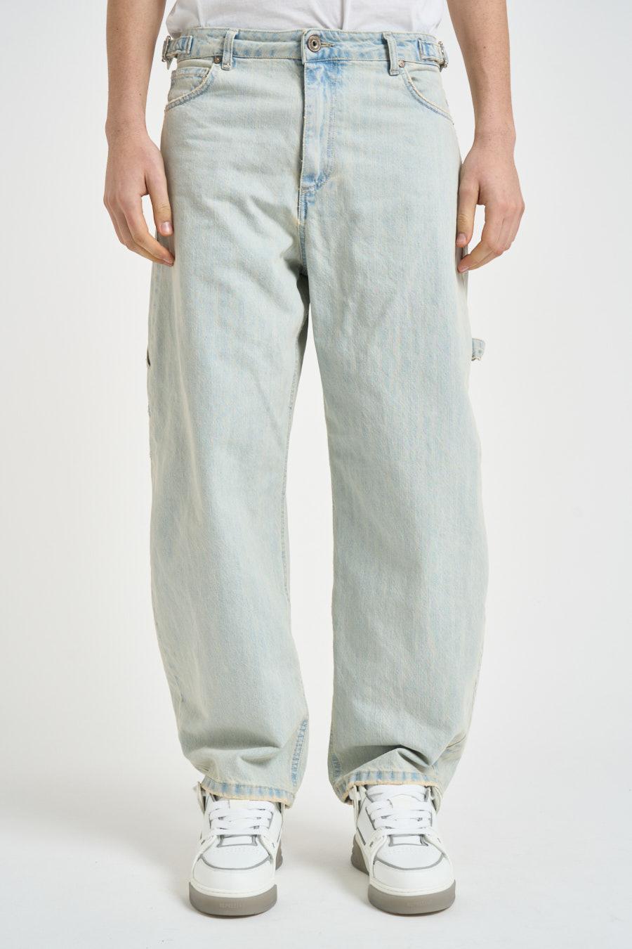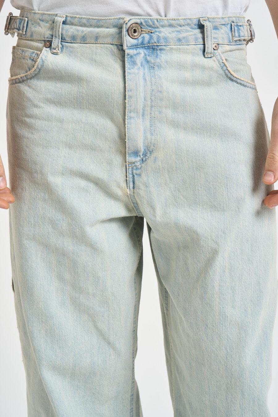 BERNA Jeans uomo ampio in denim chiaro. Modello a vita regolare con chiusura frontale tramite bottone e zip, dotato di passanti per cintura. Presenta classiche tasche anteriori e maxi tasche applicate sul retro che valorizzano lestetica utility del capo. Sul retro è presente una patch logo a contrasto. Composizione: 100% Cotone. Il modello è alto 190 cm e indossa la taglia 48.