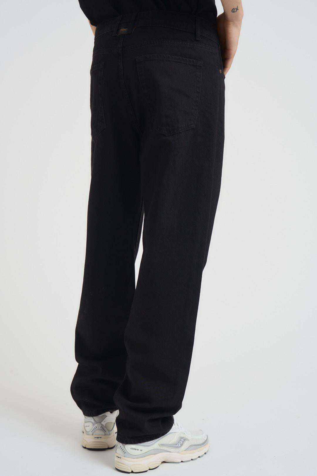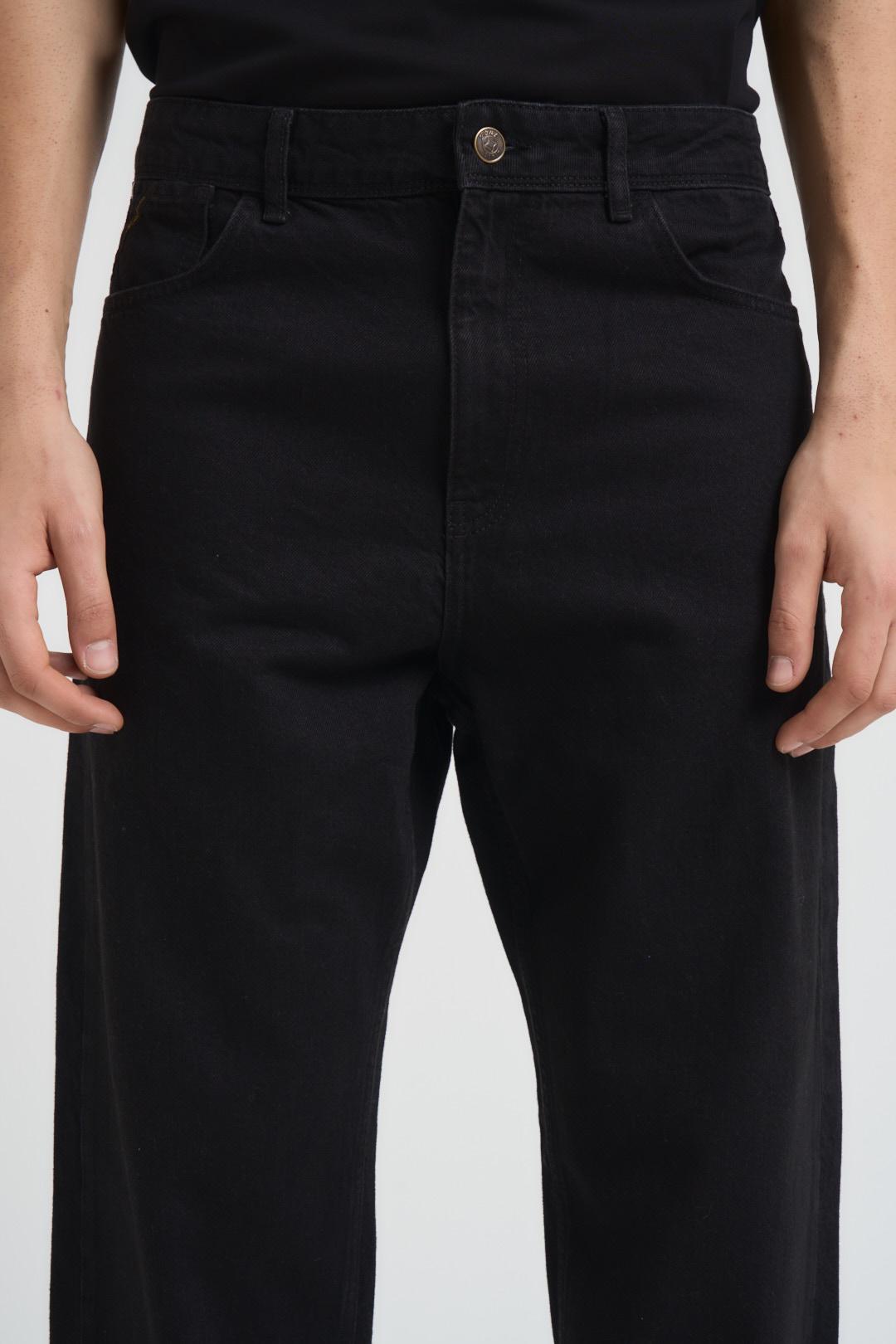 PONT DENIM Jeans uomo Cleveland in denim nero. Vita bassa, gamba larga e fondo gamba largo. Composizione: 100% cotone. Il modello è alto 190cm e indossa la taglia 31.