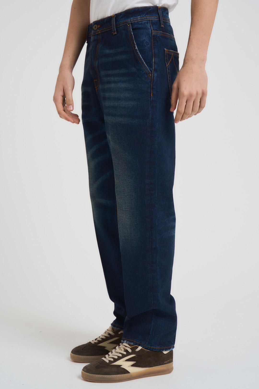 TELACRUDA Jeans uomo dritto in denim scuro. Modello con vestibilità regolare con una vita media. Cinque tasche. Passanti in vita. Chiusura frontale con zip e bottone. Composizione: 100% Cotone. Il modello è alto 190 cm e indossa la taglia 32.