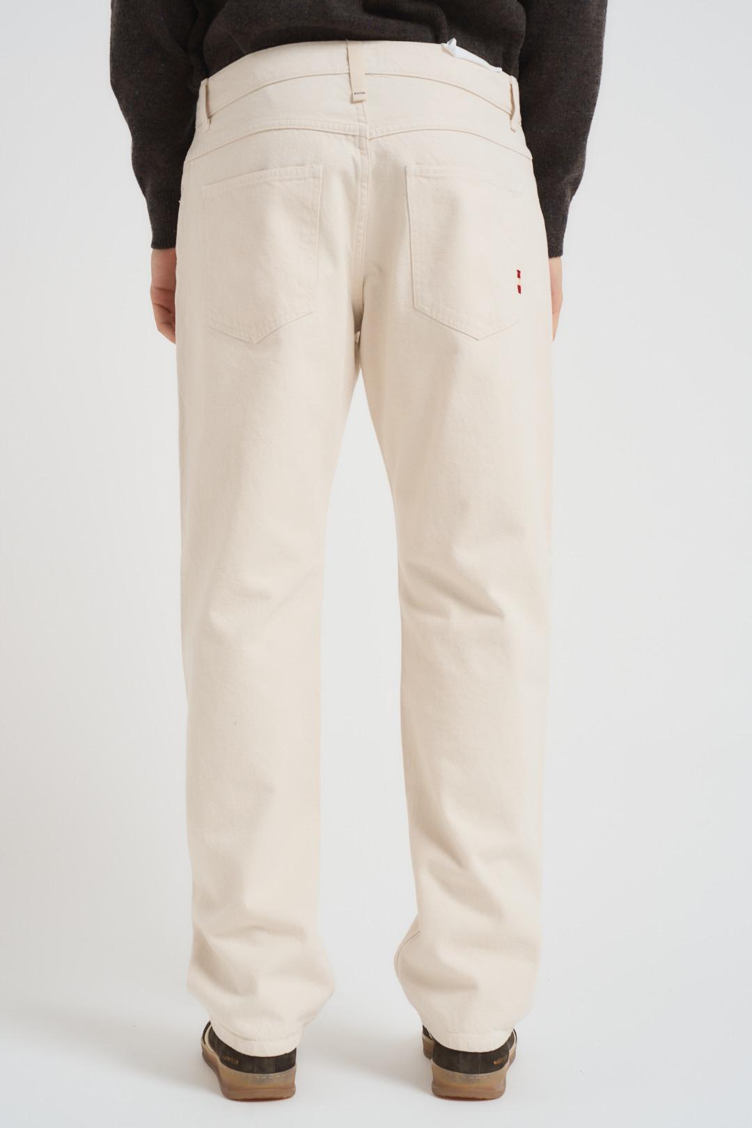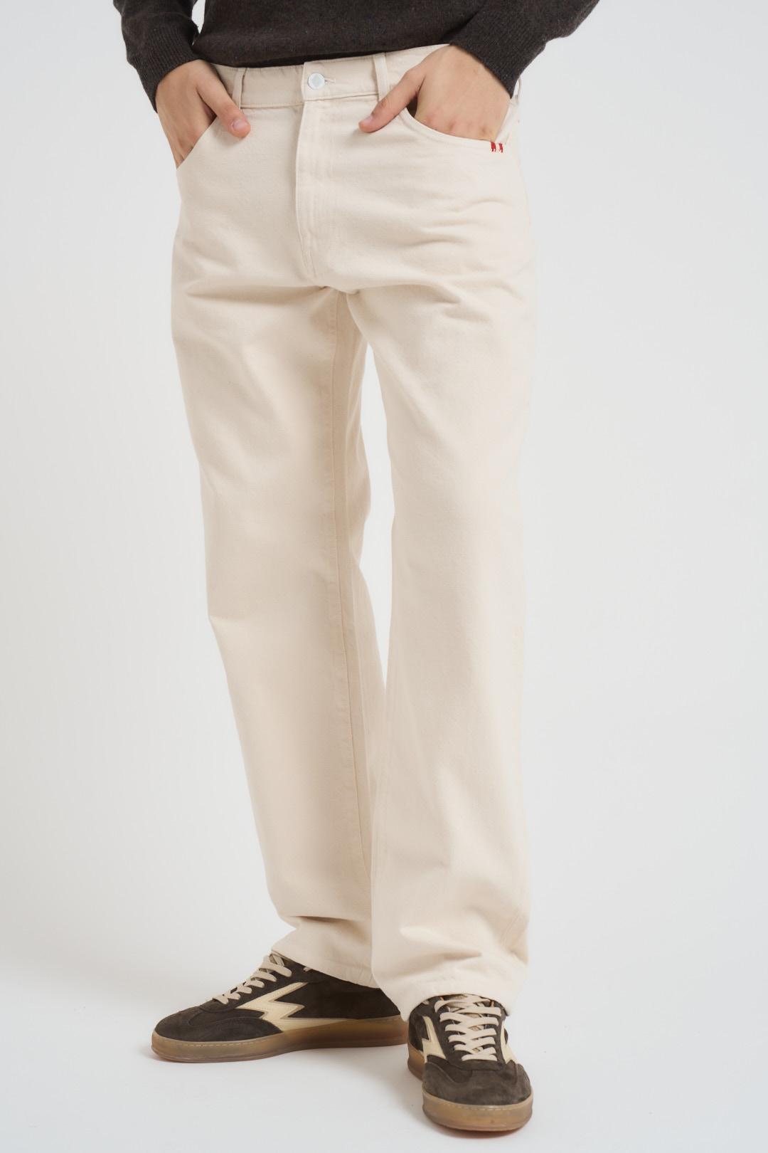 AMISH Jeans uomo James panna. Modello a vita media con passanti. Chiusura con bottone logato e zip. Due tasche sul fronte e due tasche sul retro. Loose fit. Composizione: 100% Cotone. Il modello è alto 190 cm e indossa la taglia 33.