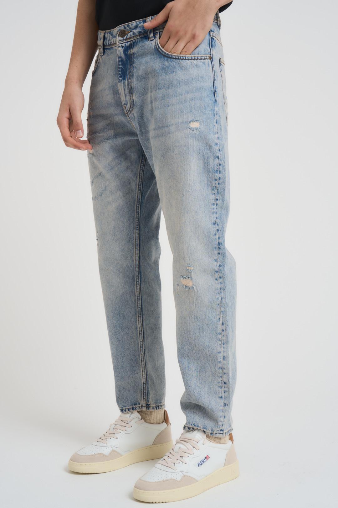 PONT DENIM Jeans uomo Yellowstone in denim chiaro con rotture. Fit cropped. Vita bassa. Gamba comoda e fondo gamba stretto. Composizione: 100% cotone. Il modello è alto 190cm e indossa la taglia 31.