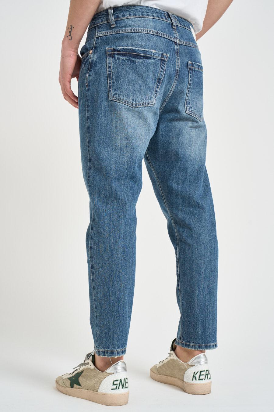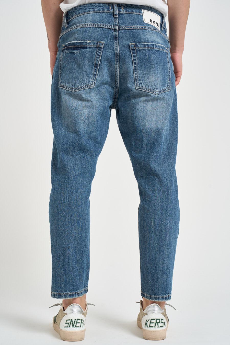 BERNA Jeans uomo regular blu medio. Modello cinque tasche dal design essenziale, caratterizzato da una vestibilità regolare e linea leggermente affusolata. Realizzato in denim compatto, presenta chiusura frontale con bottone e zip, passanti per cintura e fondo dritto. Sul retro è presente patch logo applicata in vita. Composizione: 100% Poliestere. Il modello è alto 190 cm e indossa la taglia 48.
