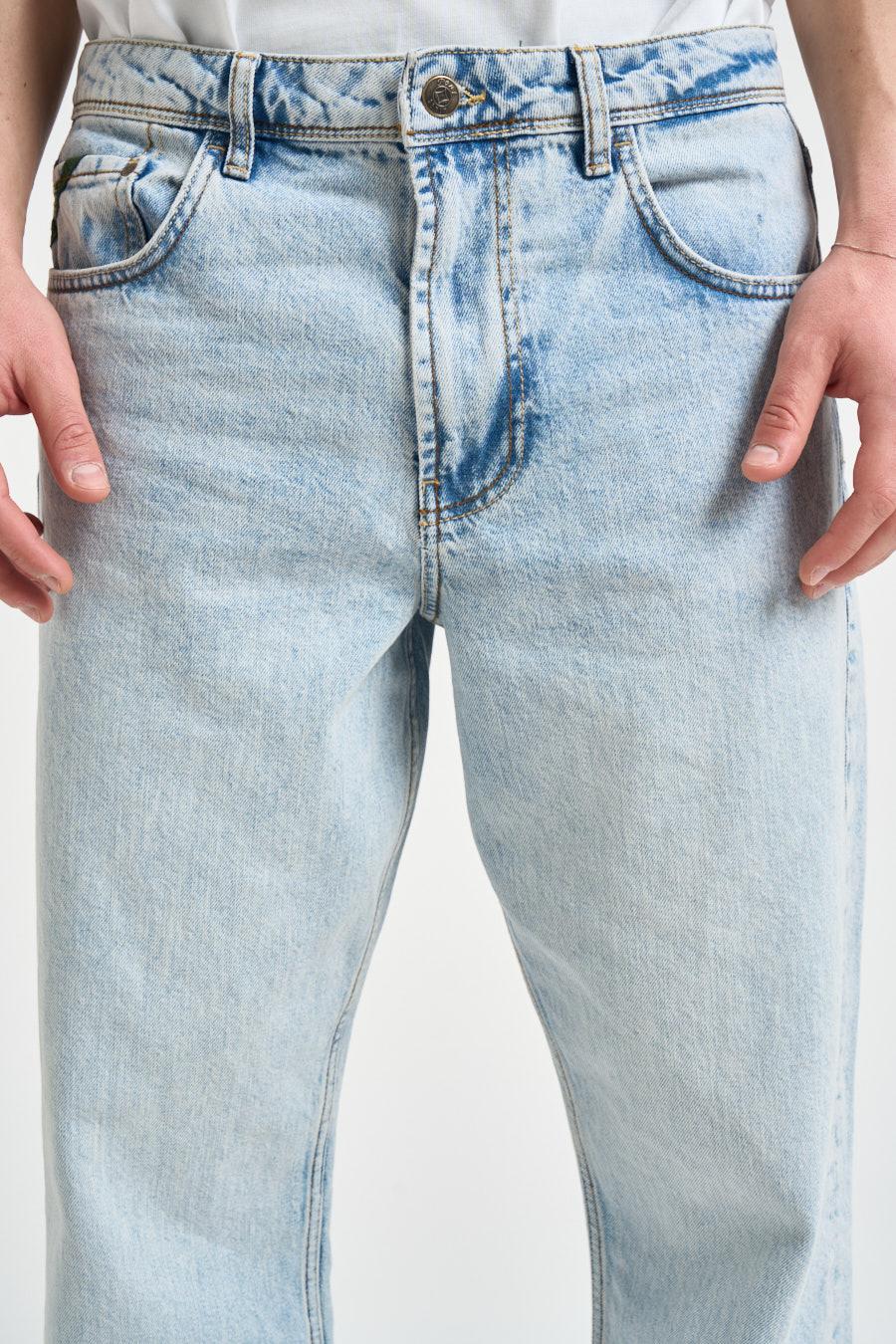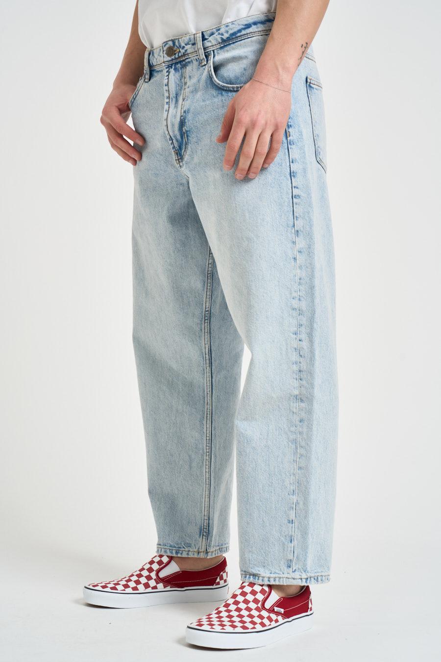 PONT DENIM Jeans uomo regular in denim chiaro. Modello a 5 tasche con impunture a contrasto. Cropped. Composizione: 100% cotone. Il modello è alto 190 cm e indossa la taglia 33.