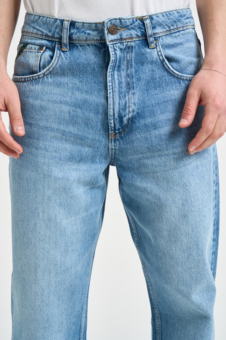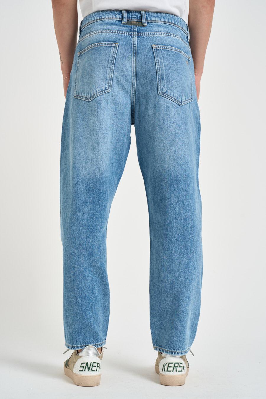 PONT DENIM Jeans uomo regular in denim medio. Modello a 5 tasche con impunture a contrasto. Cropped. Composizione: 100% cotone. Il modello è alto 190 cm e indossa la taglia 33.