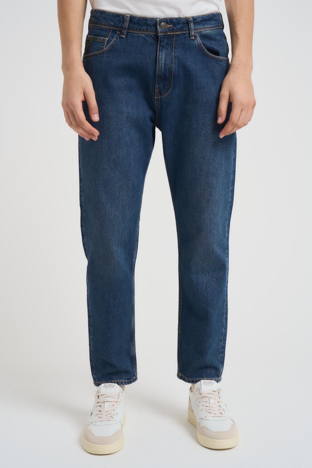 PONT DENIM Jeans uomo tapered in denim scuro. Modello classico a 5 tasche con passanti in vita. Lunghezza alla caviglia. Composizione: 100% cotone. Il modello è alto 190cm e indossa la taglia 31.