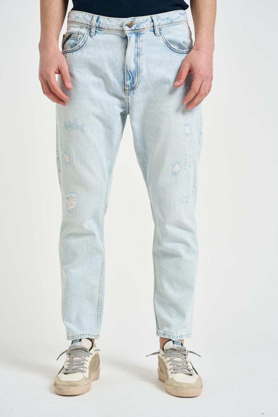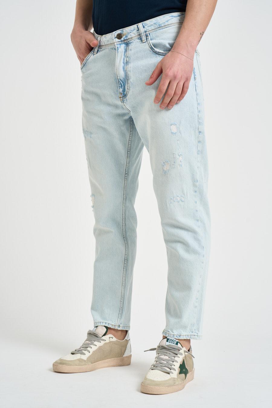PONT DENIM Jeans uomo Yellowstone in denim chiaro con rotture. Fit cropped. Vita bassa. Gamba comoda e fondo gamba stretto. Composizione: 100% cotone. Il modello è alto 190cm e indossa la taglia 32.