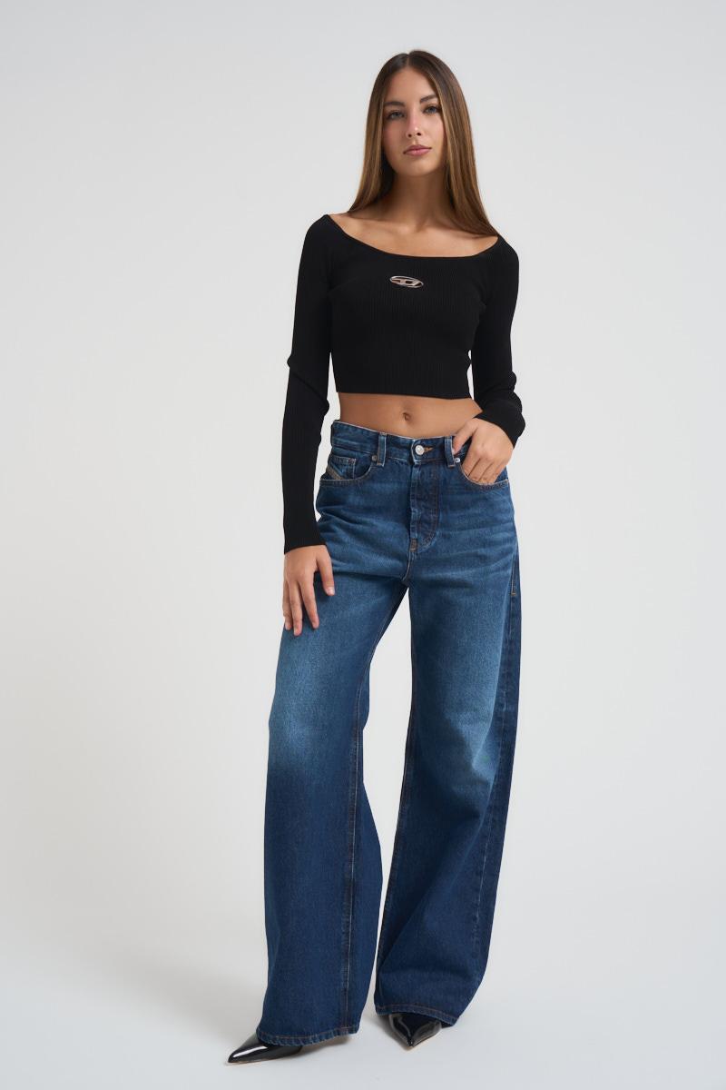 DIESEL Top donna M-Vera-Ls nera. Modello con scollo a barca. Oval D in metallo intarsiato sul petto. Dettaglio cut-out. Maniche lunghe. Slim fit. Orlo dritto. Composizione: 83% Viscosa 17% Poliestere. La modella è alta 175cm e indossa la taglia S.