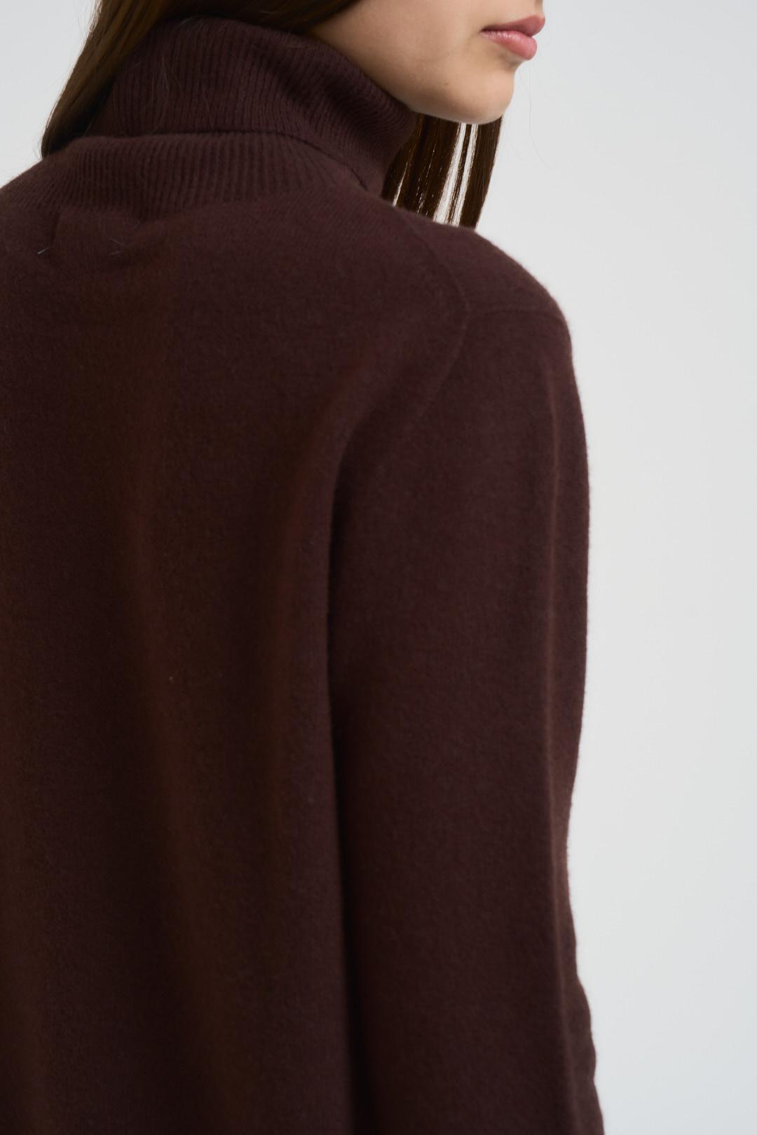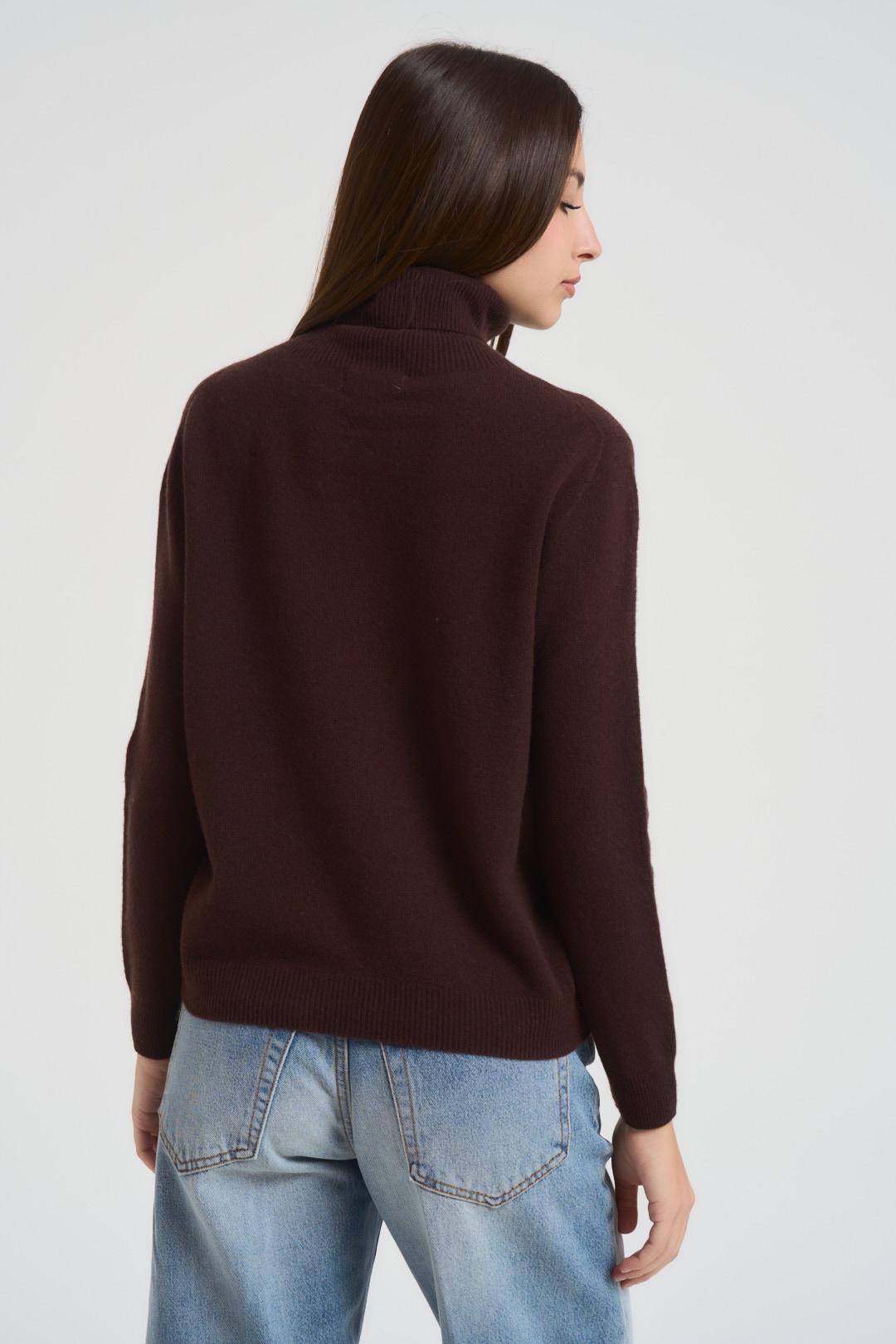 KIKISIX Maglia donna a collo alto caffè. Modello a manica lunga. Collo, polso e fondo manica a costine. Composizione: 90%lana 10%cashmere. La modella è alta 172 cm e indossa la taglia UNI.