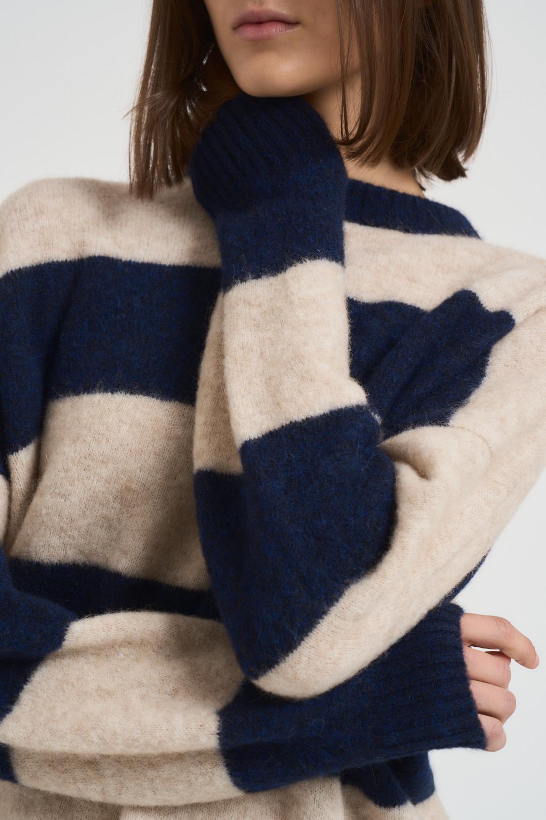 MAX MARA WEEKEND Maglia donna a righe blu e panna. Modello girocollo, regular fit e dettagli a costine. Maniche lunghe con spalle scese. Composizione: 48% Alpaca 28% Poliammide 21% Lana 3% Elastan. La modella è alta 176cm e indossa la taglia S.