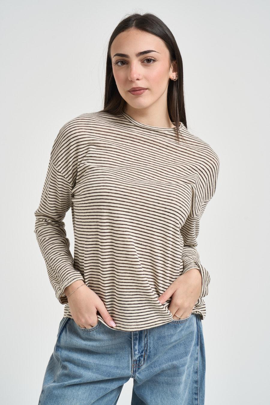 SOUVENIR CLUBBING Maglia donna a righe marrone. Modello a maniche lunghe con girocollo e linea morbida. Il capo presenta una fantasia a righe orizzontali a contrasto su tutta la superficie, con spalle leggermente scese. Fit over. Composizione: 74% cotone 26%lino. La modella è alta 172cm e indossa la taglia UNI.