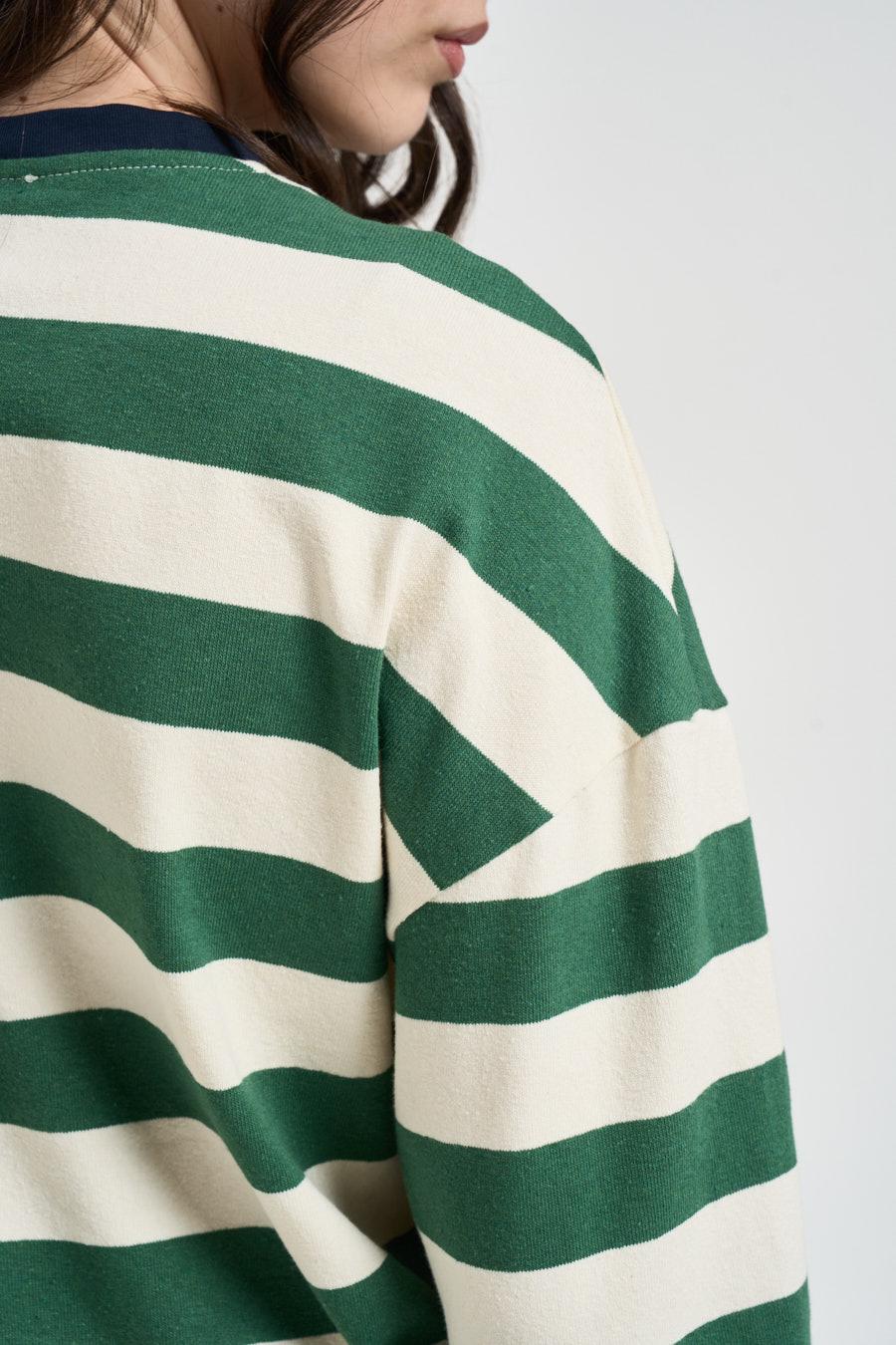 SOUVENIR CLUBBING Maglia donna a righe verde e panna. Modello girocollo a maniche lunghe realizzato in tessuto leggero. Caratterizzato da motivo a righe orizzontali a contrasto. Vestibilità morbida per uno stile rilassato. Collo rifinito con bordo a contrasto per un tocco sportivo. Caratterizzata da stampa frontale LOS ANGELES accompagnata da stelle decorative. Composizione: 77% cotone, 16% poliestere, 5% elastane. La modella è alta 172 cm e indossa la taglia S.