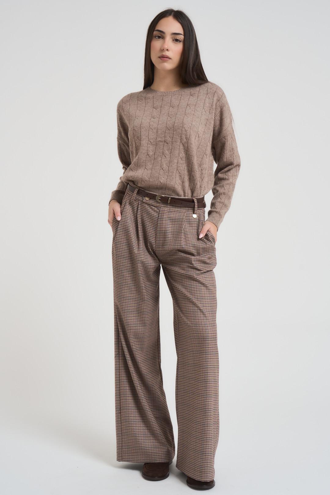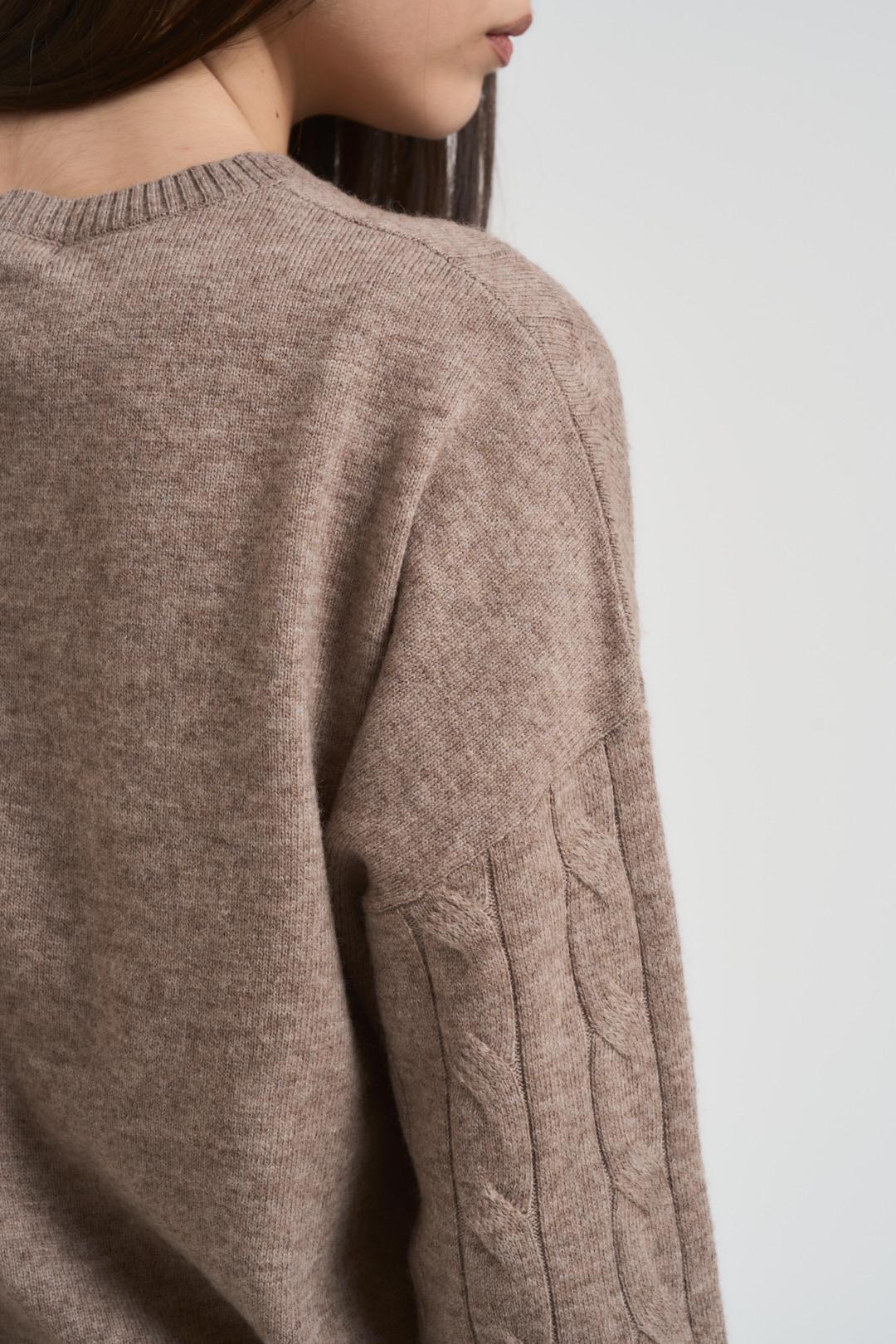 INCLOTH Maglia donna a trecce tortora. Modello a manica lunga. Collo, polsi, e orlo a costine. Composizione: 60% cashmere 20% lana 20% viscosa. La modella è alta 172 cm e indossa la taglia S/M.
