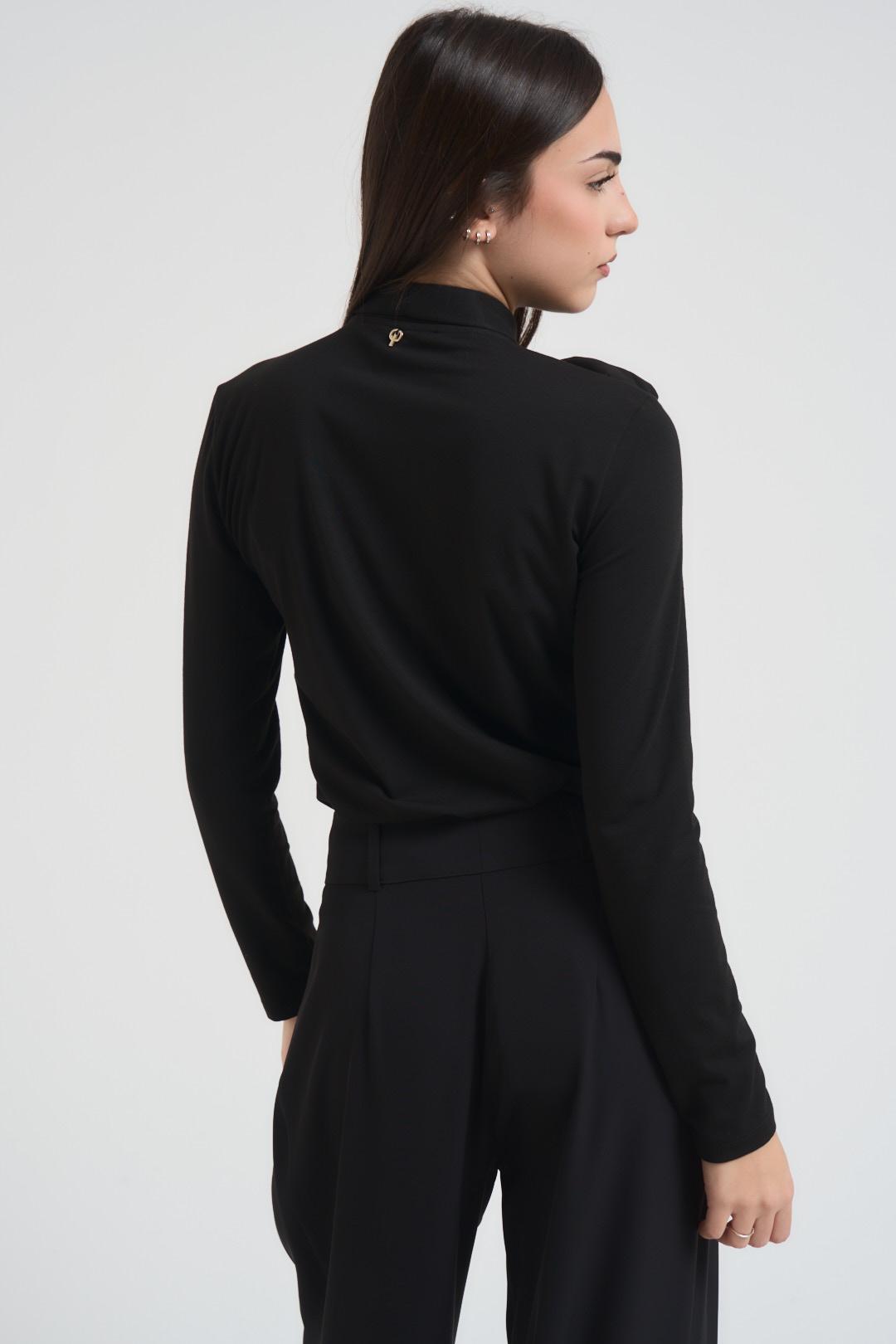 PHILIA Maglia donna con fiocco nera. Modello girocollo, manica lunga con dettaglio fiocco sul collo. Composizione: 62% poliestere 33% viscosa 5%elastane. La modella è alta 176 cm e indossa la taglia S.