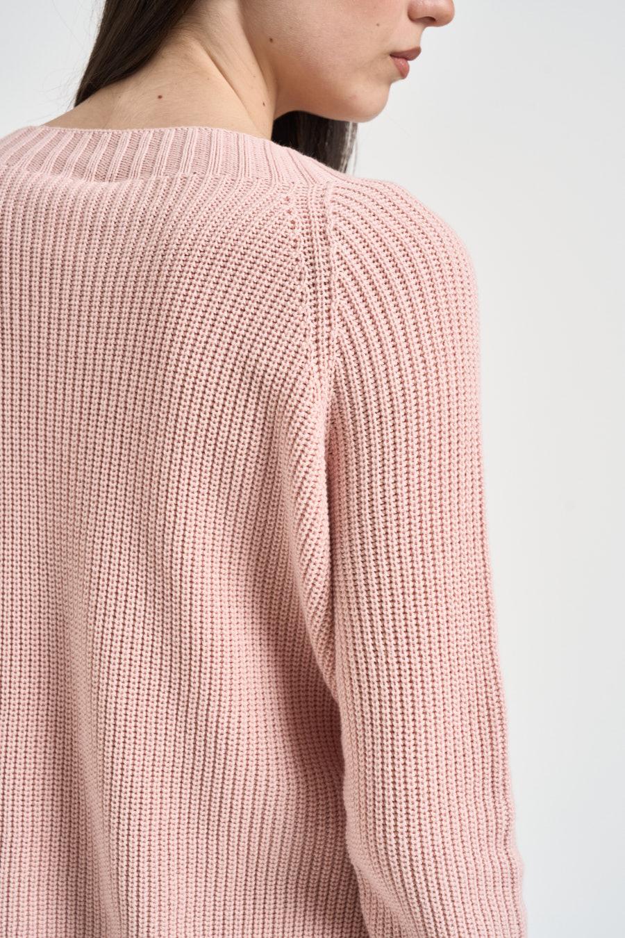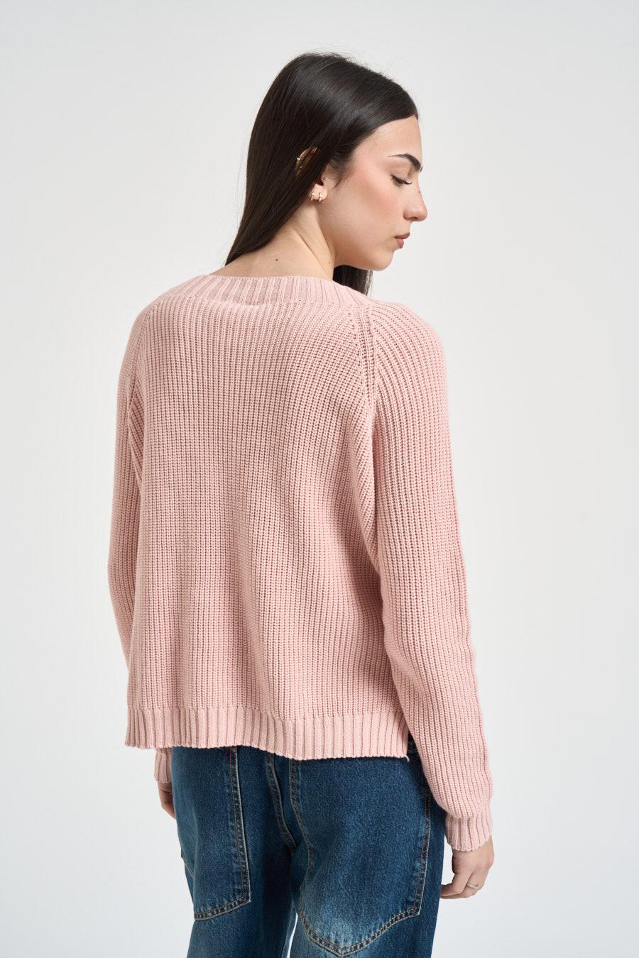 SUSY MIX Maglia donna con spacchi rosa cipria. Modello dalla vestibilità morbida. Scollo a barca. Dettagli a costine. Manica lunga. Composizione: 100% cotone. La modella è alta 172 cm e indossa la taglia UNI.