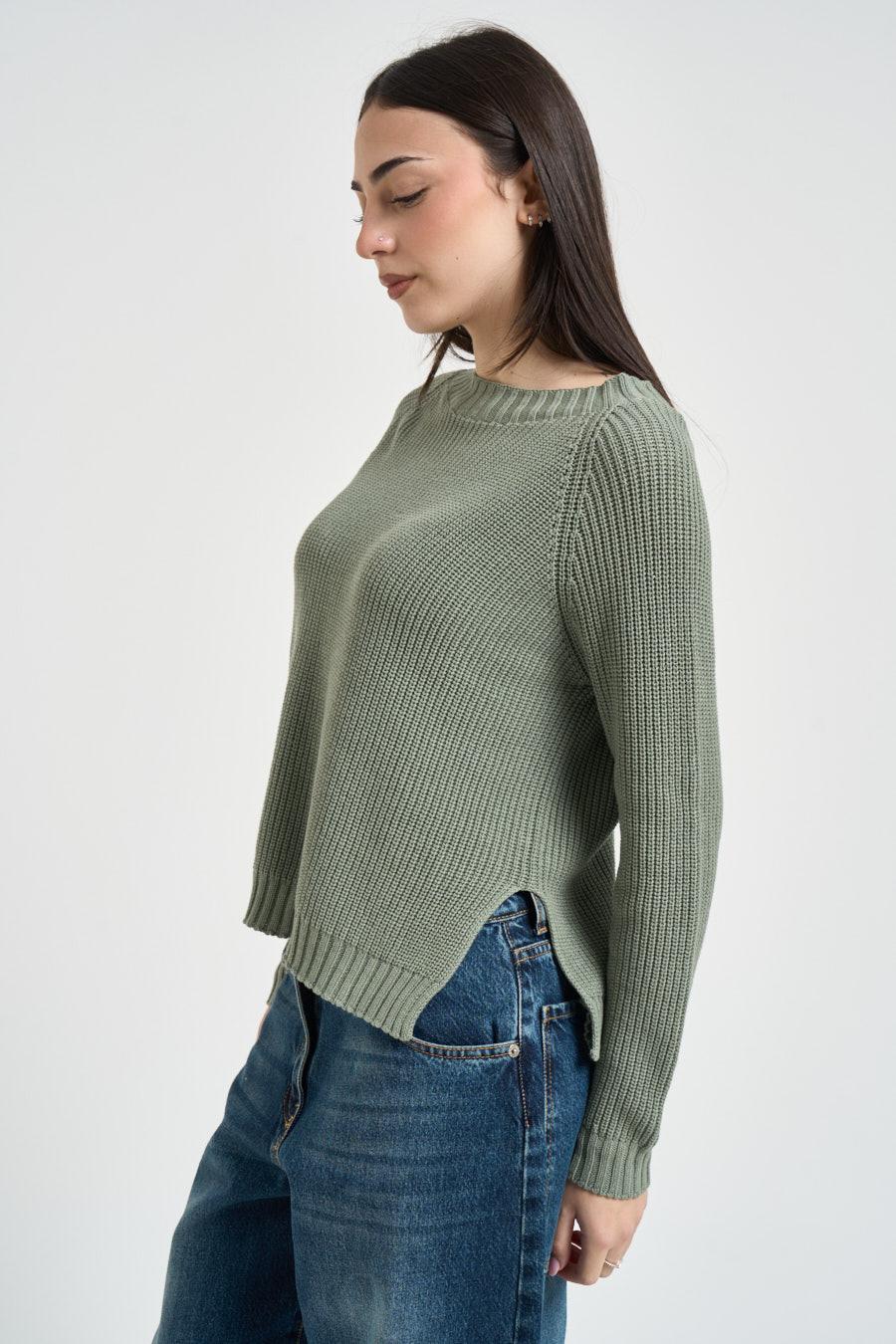 SUSY MIX Maglia donna con spacchi verde militare. Modello dalla vestibilità morbida. Scollo a barca. Dettagli a costine. Manica lunga. Composizione: 100% cotone. La modella è alta 172 cm e indossa la taglia UNI.