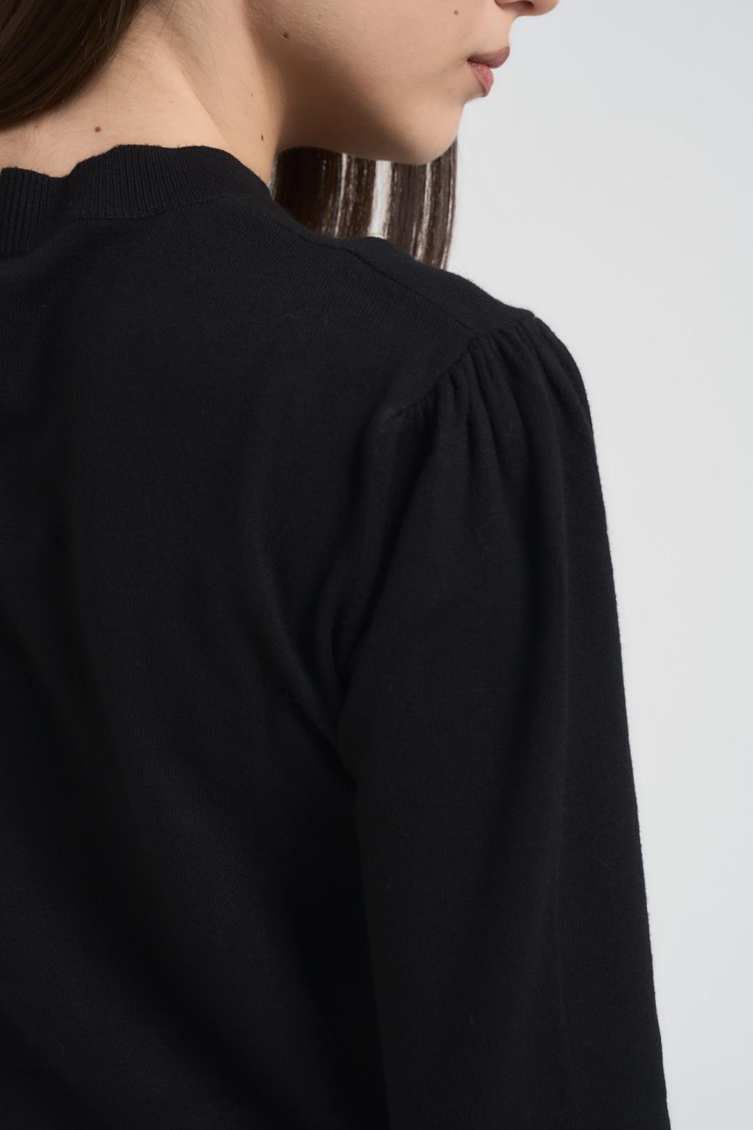 INCLOTH Maglia donna cropped nera. Modello con applicazione di strass e perline frontalmente. Manica lunga a sbuffo. Collo, orlo e polso a costine. Composizione: 100% viscosa. La modella è alta 172 cm e indossa la taglia S/M.