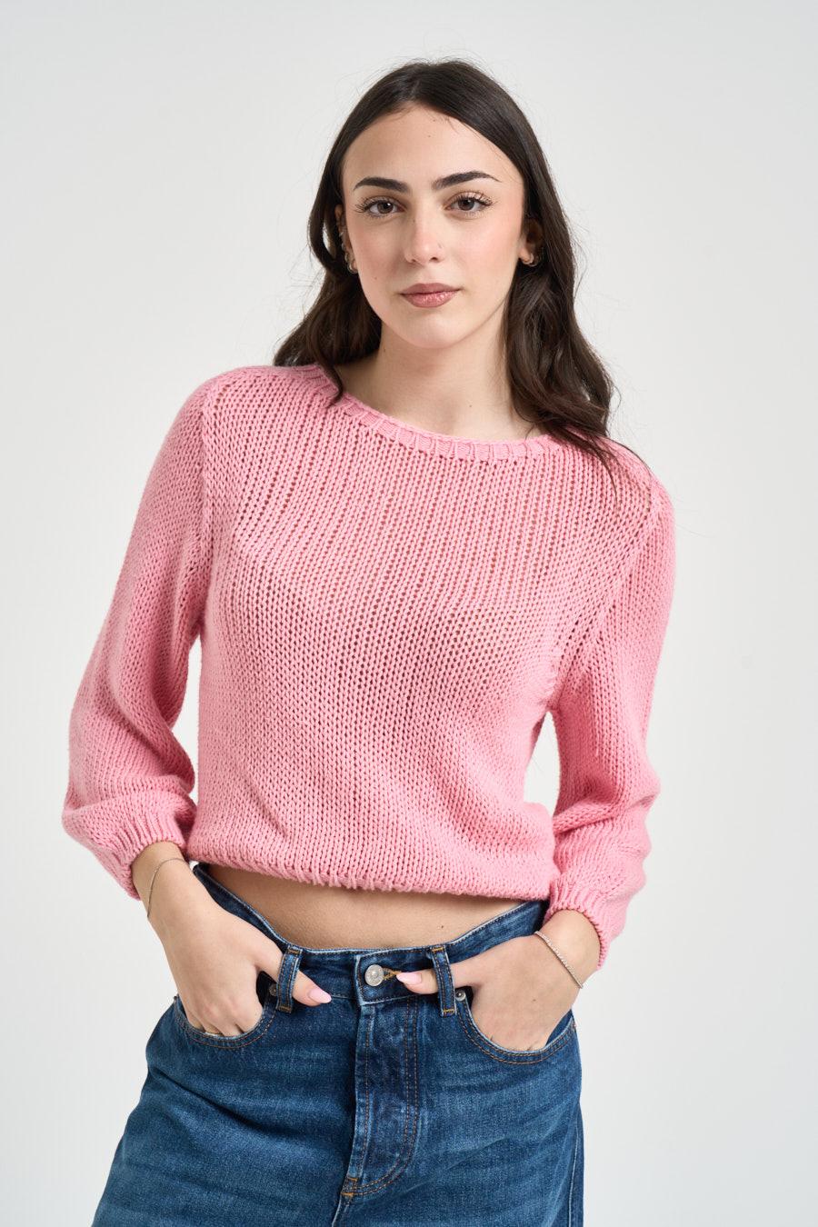VICOLO Maglia donna cropped rosa. Modello girocollo con lavorazione a maglia larga e struttura leggermente traforata che dona leggerezza e un effetto arioso al capo. Vestibilità morbida con lunghezza corta e maniche lunghe leggermente ampie. Collo, polsi e fondo rifiniti a costine. Composizione: 95%cotone 5%poliestere. La modella è alta 176cm e indossa la taglia unica.