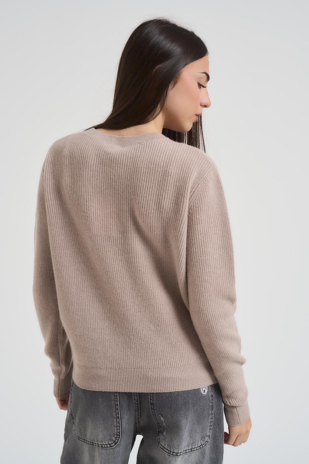 SOLOCASCMIR Maglia donna girocollo beige. Modello con manica lunga, vestibilità morbida. Composizione 100% cashmere. La modella è alta 172 cm e indossa la taglia S.