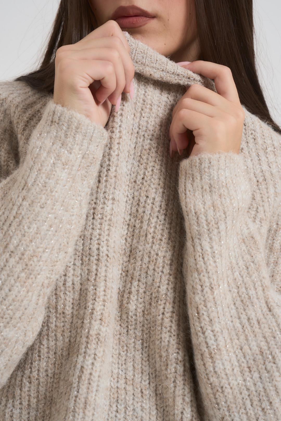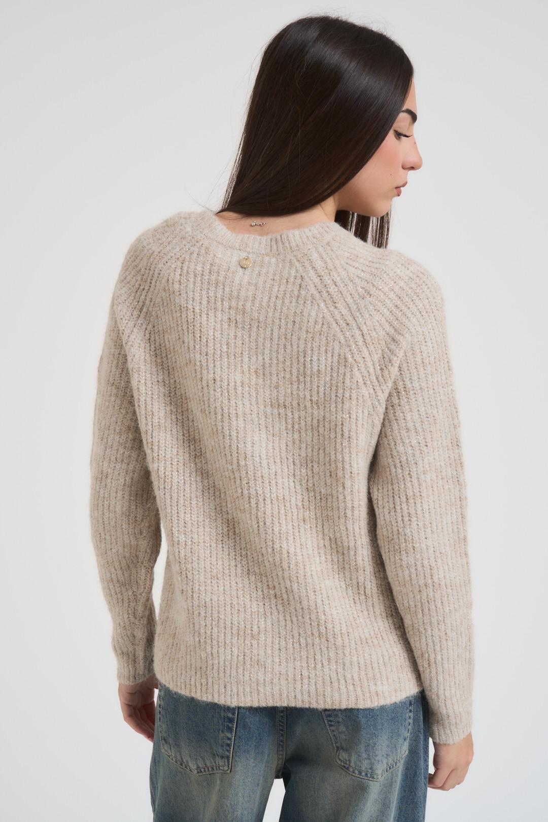 MARKUP Maglia donna girocollo beige. Modello con dettagli a costine, dettaglio logo dorato sul retro, lavorazione maglia a coste. Composizione: 71% poliestere 17% nylon 6% lana 5% lurex 1% elastane. La modella è alta 172 cm e indossa la taglia S.
